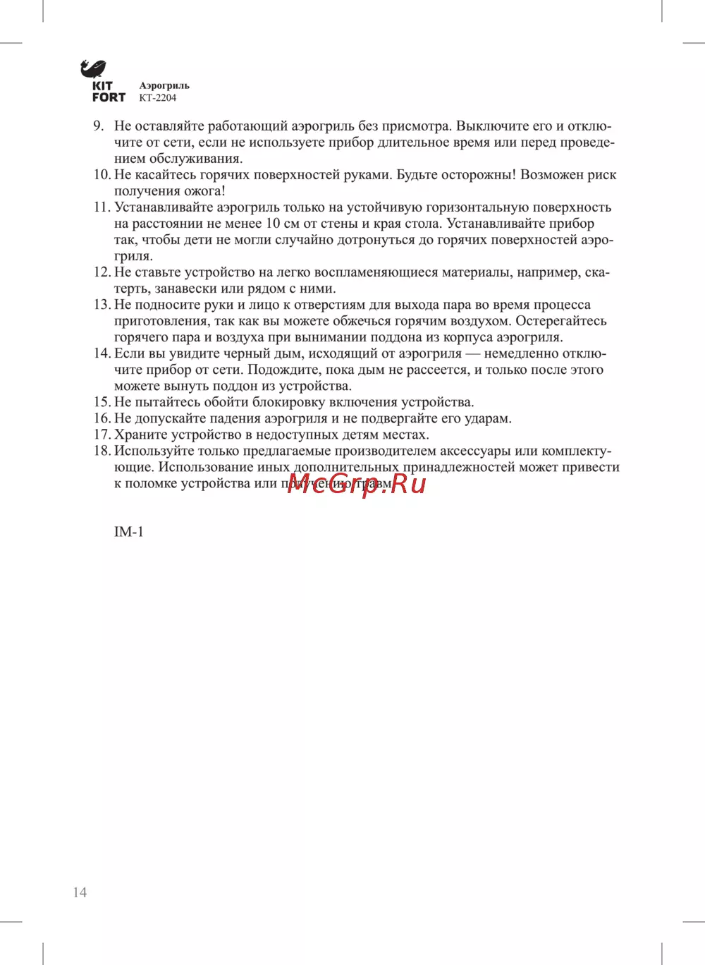 KIT Аэрогриль FORT КТ 2204 9 Не оставляйте работающий аэрогриль без присмотра Выключите его и отклю чите от сети если не используете прибор длительное время или перед проведе нием обслуживания 10 Не касайтесь горячих поверхностей руками Будьте осторожны Возможен риск получения ожога 11 Устанавливайте аэрогриль только на устойчивую горизонтальную поверхность на расстоянии не менее 10 см от стены и края стола Устанавливайте прибор так чтобы дети не могли случайно дотронуться до горячих поверхностей аэро гриля 12 Не ставьте устройство на легко воспламеняющиеся материалы например ска терть занавески или рядом с ними 13 Не подносите руки и лицо к отверстиям для выхода пара во время процесса приготовления так как вы можете обжечься горячим воздухом Остерегайтесь горячего пара и воздуха при вынимании поддона из корпуса аэрогриля 14 Если вы увидите черный дым исходящий от аэрогриля немедленно отклю чите прибор от сети Подождите пока дым не рассеется и только после этого можете вынуть поддон из устройства 15 Не пытайтесь обойти блокировку включения устройства 16 Не допускайте падения аэрогриля и не подвергайте его ударам 17 Храните устройство в недоступных детям местах 18 Используйте только предлагаемые производителем аксессуары или комплекту ющие Использование иных дополнительных принадлежностей может привести к поломке устройства или получению травм IM 1 14