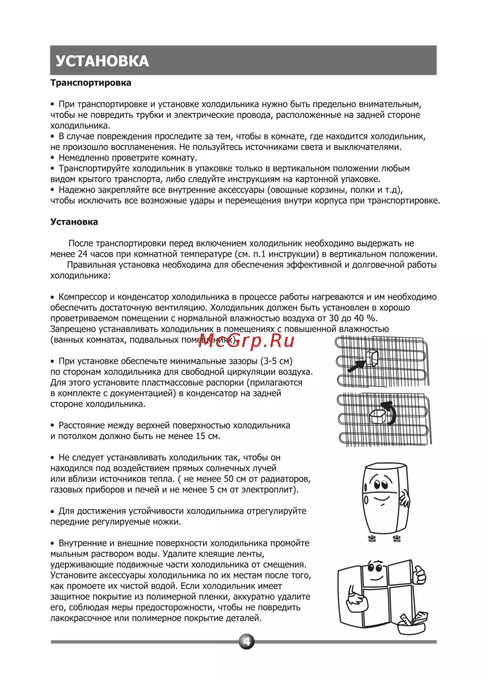 УСТАНОВКА Транспортировка При транспортировке и установке холодильника нужно быть предельно внимательным чтобы не повредить трубки и электрические провода расположенные на задней стороне холодильника В случае повреждения проследите за тем чтобы в комнате где находится холодильник не произошло воспламенения Не пользуйтесь источниками света и выключателями Немедленно проветрите комнату Транспортируйте холодильник в упаковке только в вертикальном положении любым видом крытого транспорта либо следуйте инструкциям на картонной упаковке Надежно закрепляйте все внутренние аксессуары овощные корзины полки и т д чтобы исключить все возможные удары и перемещения внутри корпуса при транспортировке Установка После транспортировки перед включением холодильник необходимо выдержать не менее 24 часов при комнатной температуре см п 1 инструкции в вертикальном положении Правильная установка необходима для обеспечения эффективной и долговечной работы холодильника Компрессор и конденсатор холодильника в процессе работы нагреваются и им необходимо обеспечить достаточную вентиляцию Холодильник должен быть установлен в хорошо проветриваемом помещении с нормальной влажностью воздуха от 30 до 40 Запрещено устанавливать холодильник в помещениях с повышенной влажностью Не следует устанавливать холодильник так чтобы он находился под воздействием прямых солнечных лучей или вблизи источников тепла не менее 50 см от радиаторов газовых приборов и печей и не менее 5 см от электроплит Для достижения устойчивости холодильника отрегулируйте передние регулируемые ножки Внутренние и внешние поверхности холодильника промойте мыльным раствором воды Удалите клеящие ленты удерживающие подвижные части холодильника от смещения Установите аксессуары холодильника по их местам после того как промоете их чистой водой Если холодильник имеет защитное покрытие из полимерной пленки аккуратно удалите его соблюдая меры предосторожности чтобы не повредить лакокрасочное или полимерное покрытие деталей о