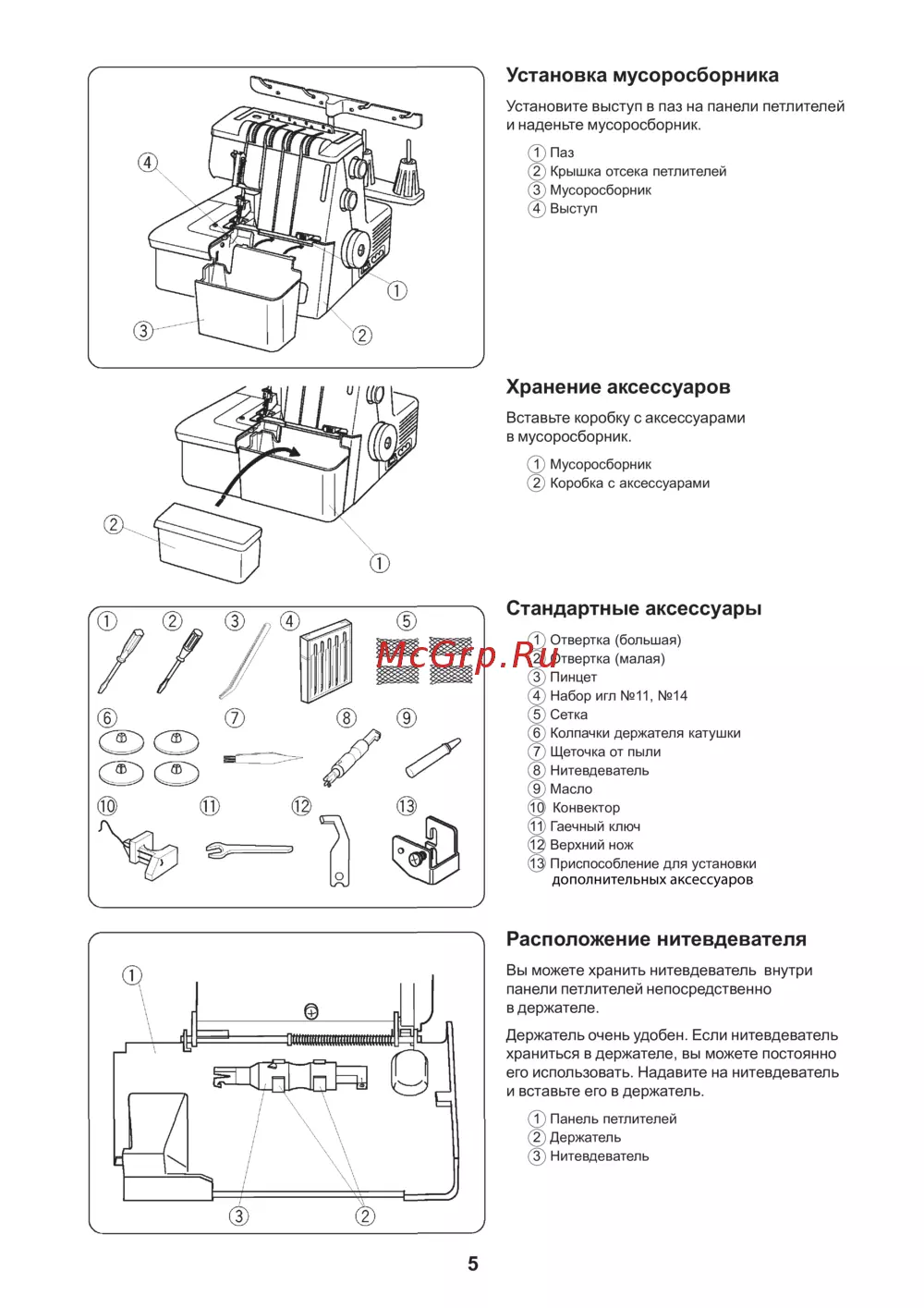 Установка мусоросборника Установите выступ в паз на панели петлителей и наденьте мусоросборник ф Паз Крышка отсека петлителей Мусоросборник ф Выступ Хранение аксессуаров Вставьте коробку с аксессуарами в мусоросборник 8 Мусоросборник Коробка с аксессуарами Стандартные аксессуары Отвертка большая Отвертка малая Пинцет ф Набор игл 11 14 Сетка Колпачки держателя катушки 7 Щеточка от пыли Нитевдеватель Масло ф Конвектор ф Гаечный ключ Верхний нож Приспособление для установки дополнительных аксессуаров Расположение нитевдевателя Вы можете хранить нитевдеватель внутри панели петлителей непосредственно в держателе Держатель очень удобен Если нитевдеватель храниться в держателе вы можете постоянно его использовать Надавите на нитевдеватель и вставьте его в держатель ф Панель петлителей ф Держатель ф Нитевдеватель 5