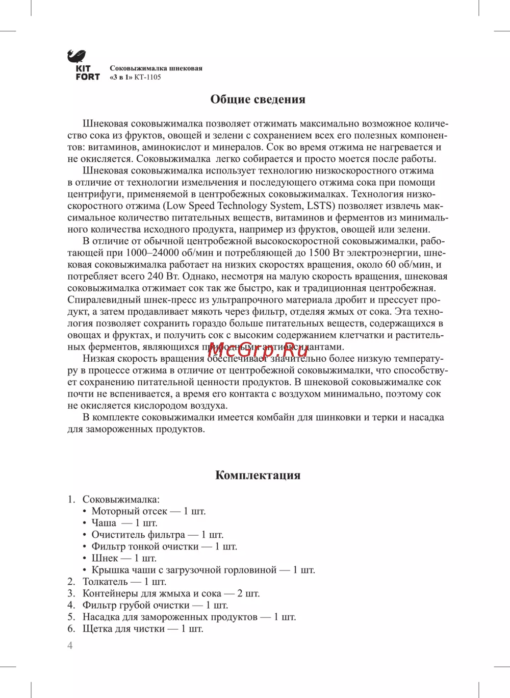й KIT Соковыжималка шнековая FORT 3 в 1 КТ 1105 Общие сведения Шнековая соковыжималка позволяет отжимать максимально возможное количе ство сока из фруктов овощей и зелени с сохранением всех его полезных компонен тов витаминов аминокислот и минералов Сок во время отжима не нагревается и не окисляется Соковыжималка легко собирается и просто моется после работы Шнековая соковыжималка использует технологию низкоскоростного отжима в отличие от технологии измельчения и последующего отжима сока при помощи центрифуги применяемой в центробежных соковыжималках Технология низко скоростного отжима Low Speed Technology System LSTS позволяет извлечь мак симальное количество питательных веществ витаминов и ферментов из минималь ного количества исходного продукта например из фруктов овощей или зелени В отличие от обычной центробежной высокоскоростной соковыжималки рабо тающей при 1000 24000 об мин и потребляющей до 1500 Вт электроэнергии шне ковая соковыжималка работает на низких скоростях вращения около 60 об мин и потребляет всего 240 Вт Однако несмотря на малую скорость вращения шнековая соковыжималка отжимает сок так же быстро как и традиционная центробежная Спиралевидный шнек пресс из ультрапрочного материала дробит и прессует про дукт а затем продавливает мякоть через фильтр отделяя жмых от сока Эта техно логия позволяет сохранить гораздо больше питательных веществ содержащихся в овощах и фруктах и получить сок с высоким содержанием клетчатки и раститель ных ферментов являющихся природными антиоксидантами Низкая скорость вращения обеспечивает значительно более низкую температу ру в процессе отжима в отличие от центробежной соковыжималки что способству ет сохранению питательной ценности продуктов В шнековой соковыжималке сок почти не вспенивается а время его контакта с воздухом минимально поэтому сок не окисляется кислородом воздуха В комплекте соковыжималки имеется комбайн для шинковки и терки и насадка для замороженных продуктов Комплектация 1 Соковыжималка Моторный отсек 1 шт Чаша 1 шт Очиститель фильтра 1 шт Фильтр тонкой очистки 1 шт Шнек 1 шт Крышка чаши с загрузочной горловиной 1 шт 2 Толкатель 1 шт 3 Контейнеры для жмыха и сока 2 шт 4 Фильтр грубой очистки 1 шт 5 Насадка для замороженных продуктов 1 шт 6 Щетка для чистки 1 шт 4