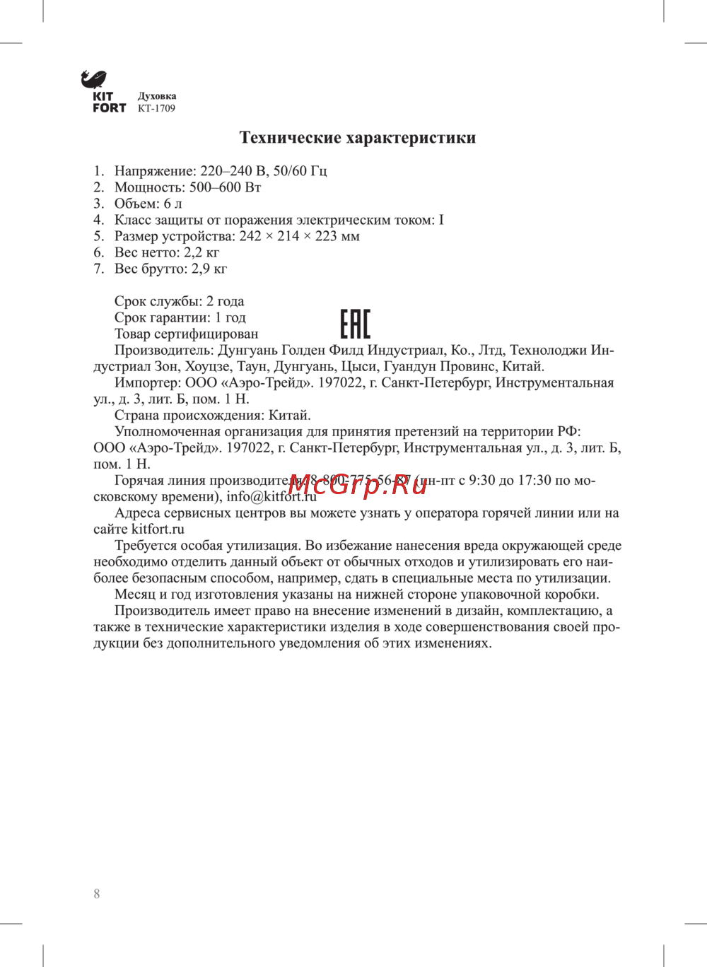 KIT Духовка FORT KT 1709 Технические характеристики 1 Напряжение 220 240 В 50 60 Гц 2 Мощность 500 600 Вт 3 Объем 6 л 4 Класс защиты от поражения электрическим током I 5 Размер устройства 242 х 214 х 223 мм 6 Вес нетто 2 2 кг 7 Вес брутто 2 9 кг Срок службы 2 года Срок гарантии 1 год ГПГ Товар сертифицирован ЕПL Производитель Дунгуань Голден Филд Индустриал Ко Лтд Технолоджи Ин дустриал Зон Хоуцзе Таун Дунгуань Цыси Гуандун Провинс Китай Импортер ООО Аэро Трейд 197022 г Санкт Петербург Инструментальная ул д 3 лит Б пом 1 Н Страна происхождения Китай Уполномоченная организация для принятия претензий на территории РФ ООО Аэро Трейд 197022 г Санкт Петербург Инструментальная ул д 3 лит Б пом 1Н Горячая линия производителя 8 800 775 56 87 пн пт с 9 30 до 17 30 по мо сковскому времени info kitfort ru Адреса сервисных центров вы можете узнать у оператора горячей линии или на сайте kitfort ru Требуется особая утилизация Во избежание нанесения вреда окружающей среде необходимо отделить данный объект от обычных отходов и утилизировать его наи более безопасным способом например сдать в специальные места по утилизации Месяц и год изготовления указаны на нижней стороне упаковочной коробки Производитель имеет право на внесение изменений в дизайн комплектацию а также в технические характеристики изделия в ходе совершенствования своей про дукции без дополнительного уведомления об этих изменениях 8