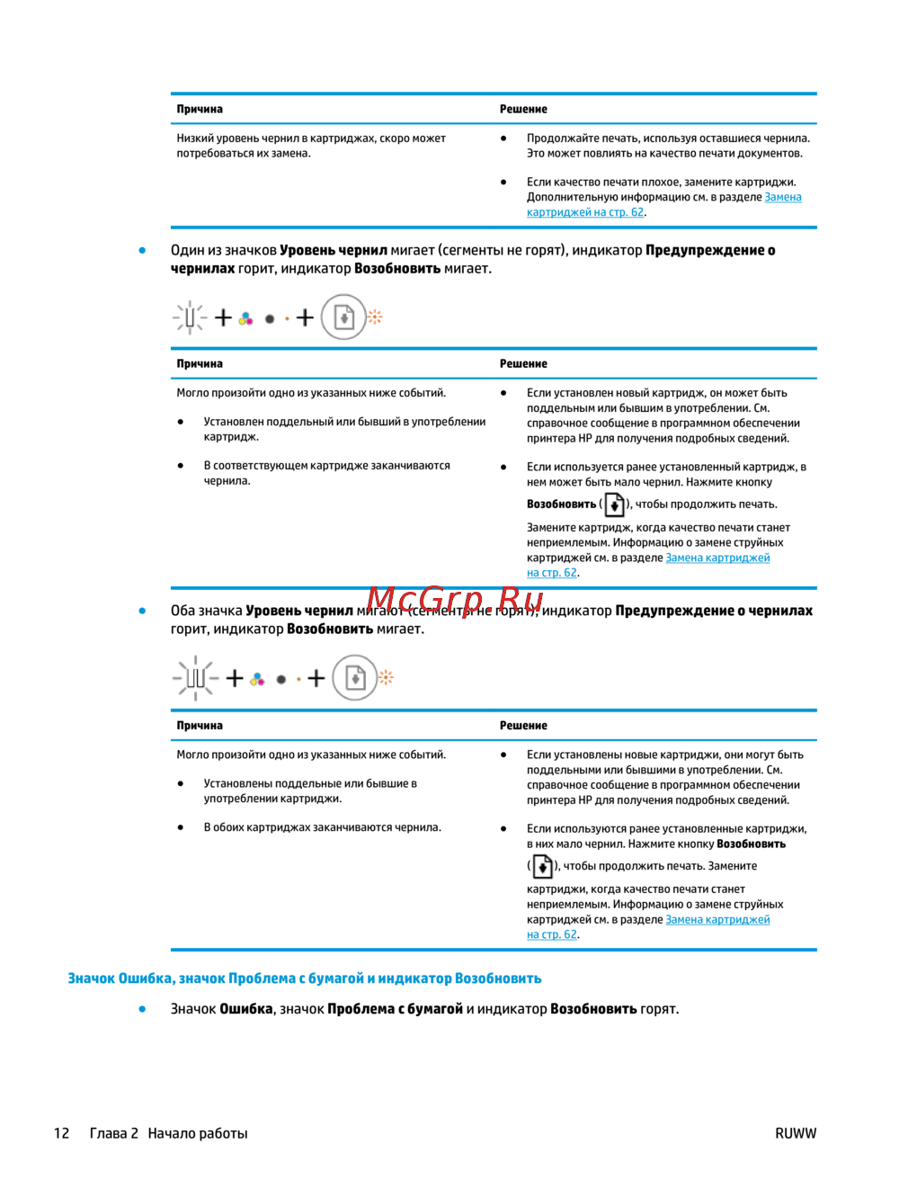 - Оба значка уровень чернил мигают сегменты не горят индикатор предупреждение о чернилах горит индикатор возобновить мигает p.18