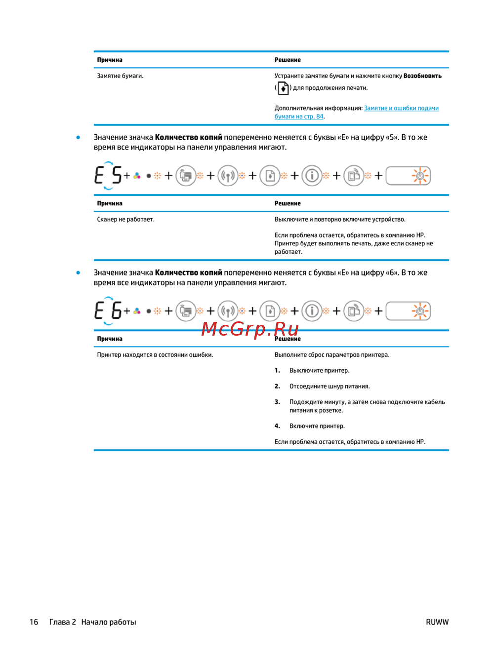 - Значение значка количество копий попеременно меняется с буквы е на цифру 2 в то же время значок ошибка значок проблема с бумагой и индикатор возобновить мигают p.20