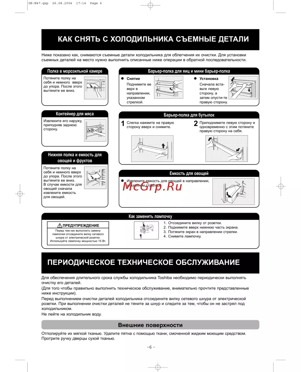 GR N47 qxp 26 08 2004 17 14 Page 6 КАК СНЯТЬ С ХОЛОДИЛЬНИКА СЪЕМНЫЕ ДЕТАЛИ Ниже показано как снимаются съемные детали холодильника для облегчения их очистки Для установки съемных деталей на место нужно выполнить описанные ниже операции в обратной последовательности Барьер полка для яиц и мини барьер полка Полка в морозильной камере Потяните полку на себя и немного вверх до упора После этого вытяните ее вниз Снятие Установка Поднимите ее верх в направлении указанном стрелкой Сначала вста вьте левую сторону а затем опусти те правую сторону Барьер полка для бутылок Слегка нажмите на правую сторону вверх и снимите Приподнимите левую сторону и одновременно с этим потяните правую сторону на себя Нижняя полка и емкость для овощей и фруктов Потяните полку на себя и немного вверх до упора После этого вытяните ее вниз В случае емкости для овощей сначала извлеките емкость для овощей У Емкость для овощей Извлеките емкость для овощей в направлении указанном стрелкой Как заменить лампочку 1 Отсоедините вилку от розетки 2 Поднимите вверх нижнюю часть экрана 3 Потяните экран в направлении стрелки 4 Снимите лампочку Д ПРЕДУПРЕЖДЕНИЕ Перед тем как выполнить замену лампочки отсоедините вилку сетевого шнура от электрической розетки Используйте лампочку мощностью 15 Вт ПЕРИОДИЧЕСКОЕ ТЕХНИЧЕСКОЕ ОБСЛУЖИВАНИЕ Для обеспечения длительного срока службы холодильника Toshiba необходимо периодически выполнять очистку его деталей Для того чтобы правильно выполнить техническое обслуживание внимательно прочтите представленные ниже инструкции Перед выполнением очистки деталей холодильника отсоедините вилку сетевого шнура от электрической розетки При выполнении очистки деталей не тяните за шнур и следите за тем чтобы он не застрял под холодильником Не лейте на холодильник воду Внешние поверхности Отполируйте их мягкой тканью Удалите пятна с помощью ткани смоченной жидким моющим средством Протрите ручку дверцы сухой тканью 6
