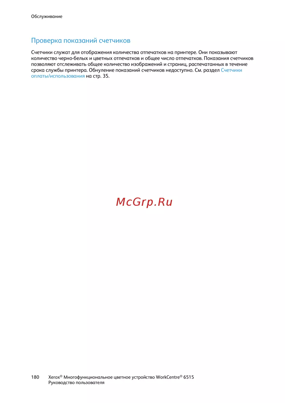 Xerox WorkCentre 6515DN [180/320] Счетчики служат для отображения количества отпечатков на принтере они показывают количество черно белых и цветных отпечатков и общее число отпечатков показания счетчиков позволяют отслеживать общее количество изображений и страниц распечатанных в течение срока службы принтера обнуление показаний счетчиков недоступно см раздел счетчики оплаты использования на стр 35