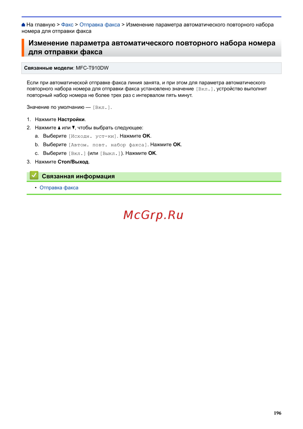 На главную > Факс > Отправка факса > Изменение параметра автоматического повторного набора
