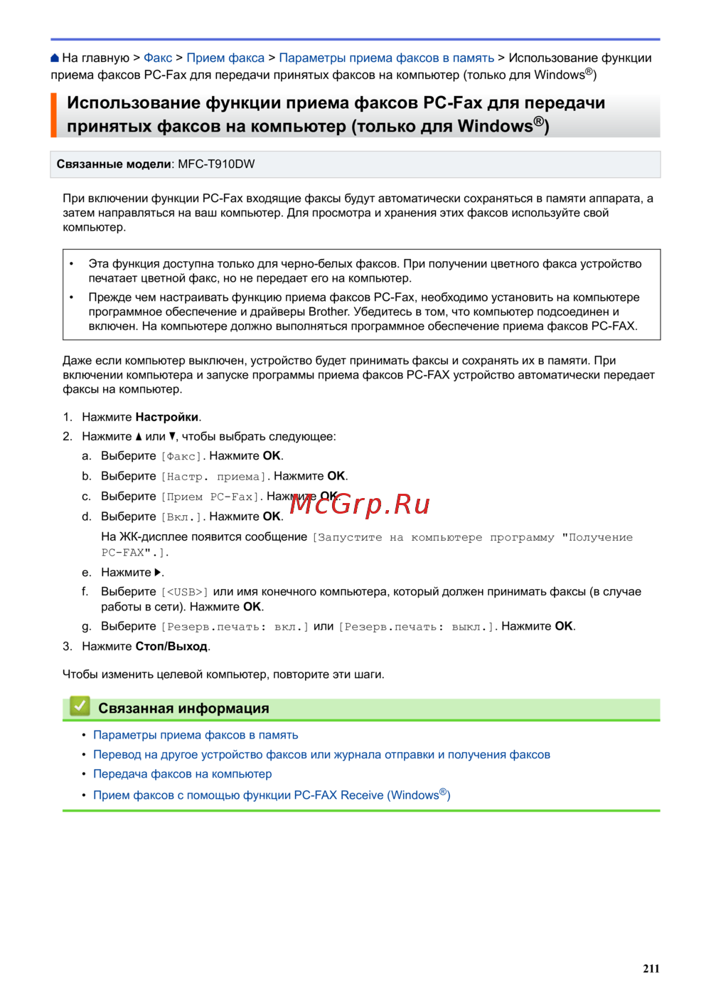 приема факсов PC-Fax для передачи принятых факсов на компьютер (только для Windows