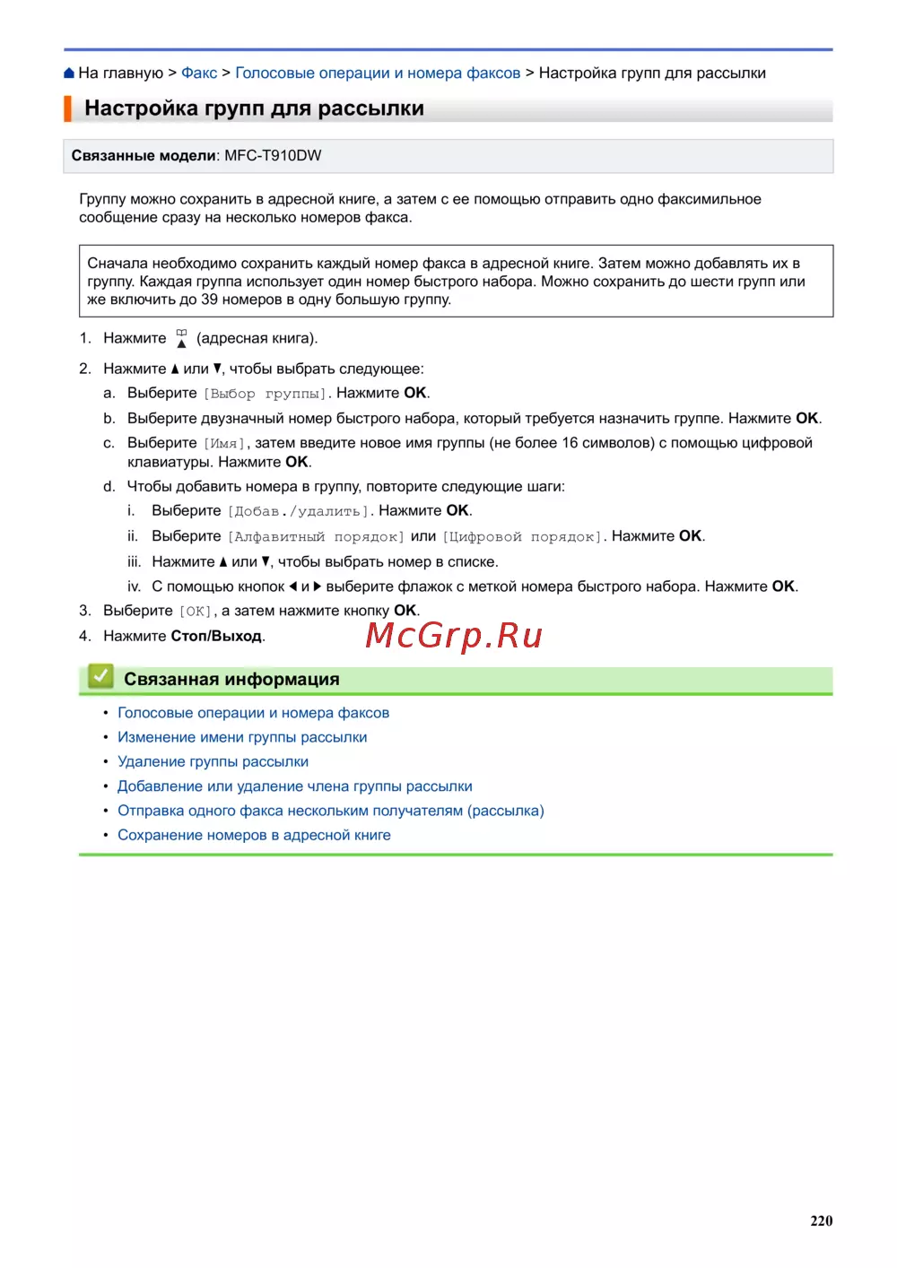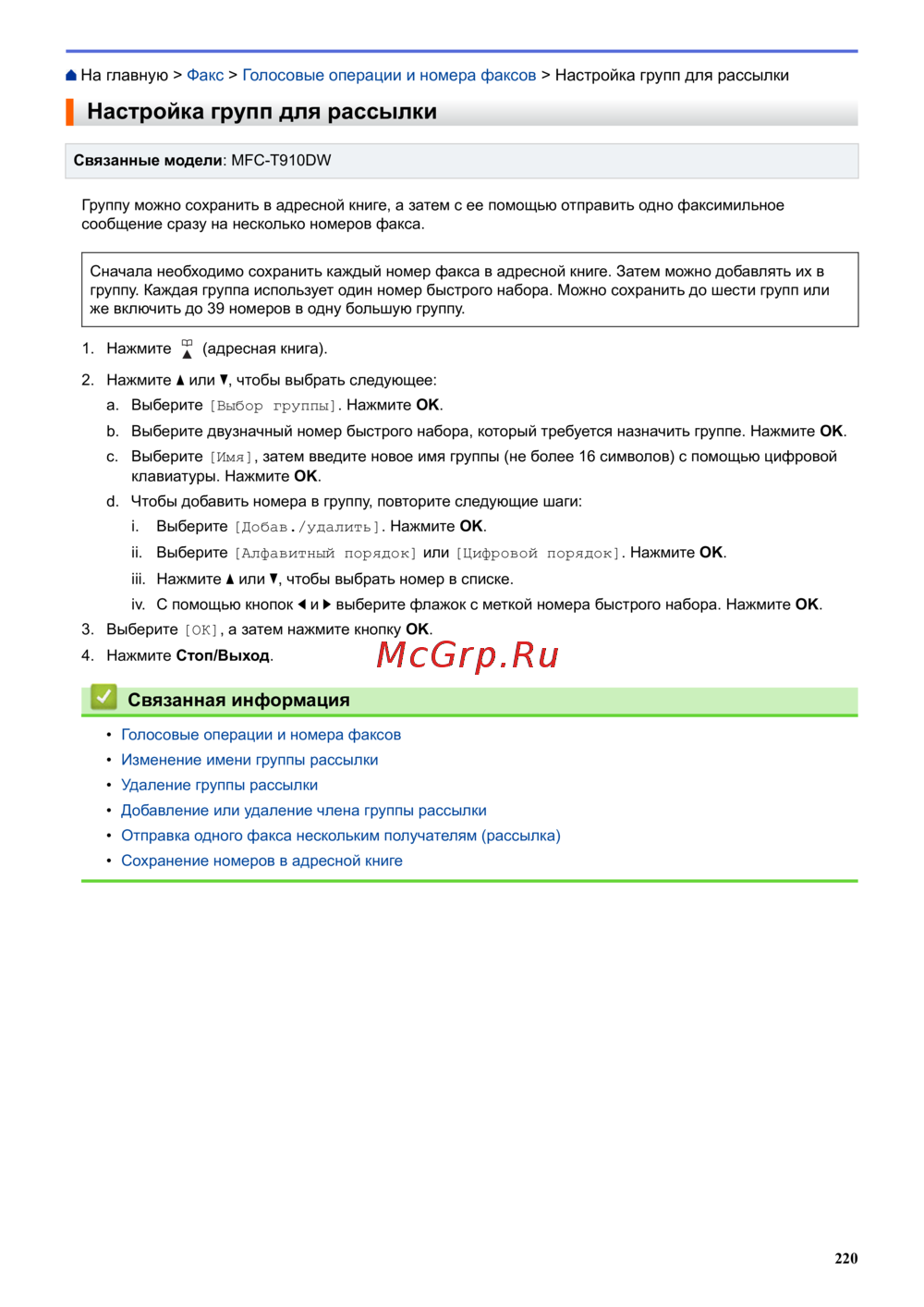 На главную > Факс > Голосовые операции и номера факсов > Настройка групп для рассылки