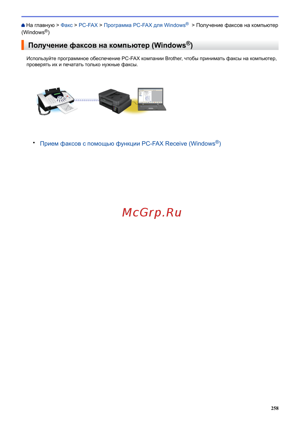 Используйте программное обеспечение PC-FAX компании Brother, чтобы принимать факсы на компьютер,