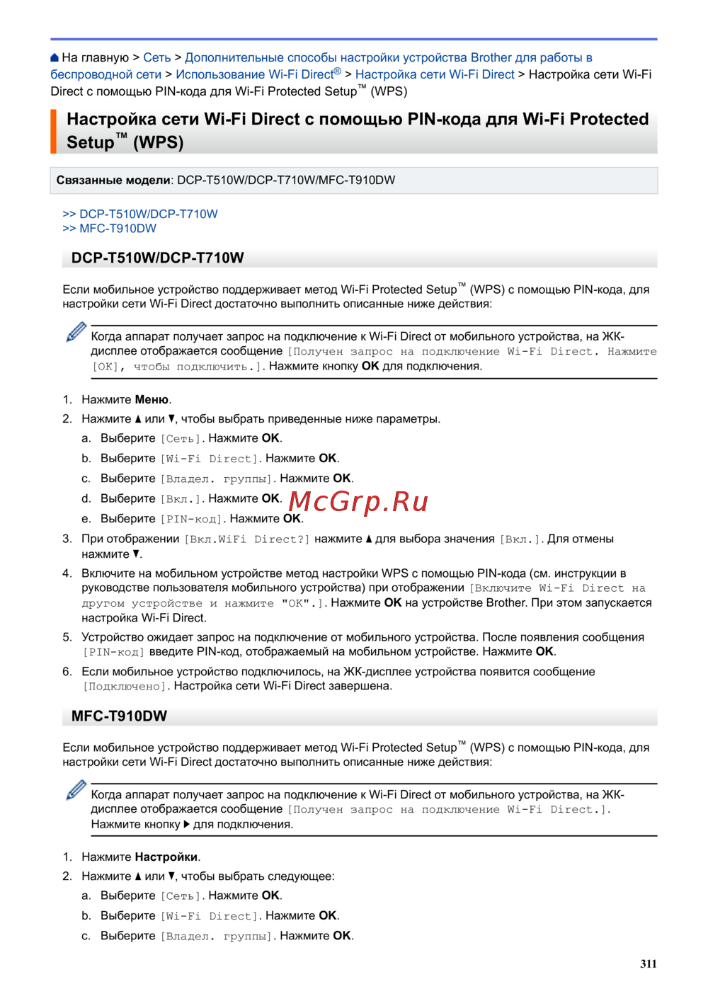 Brother DCP-T310 InkBenefit Plus [317/562] Настройка сети wi fi direct с помощью pin кода для wi fi protected setu