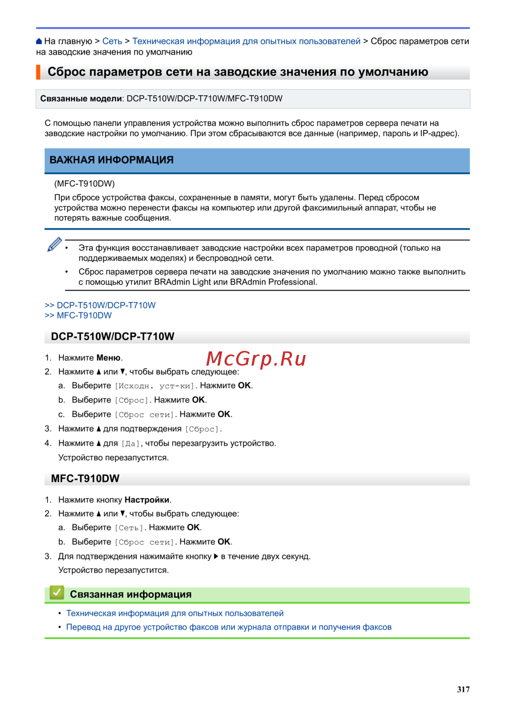 Brother DCP-T310 InkBenefit Plus — сброс параметров сети на заводские значения: пошаговая инструкция [323/562]