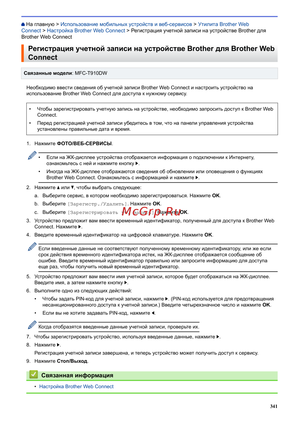 Brother Web Connect. Ознакомьтесь с информацией и нажмите c.