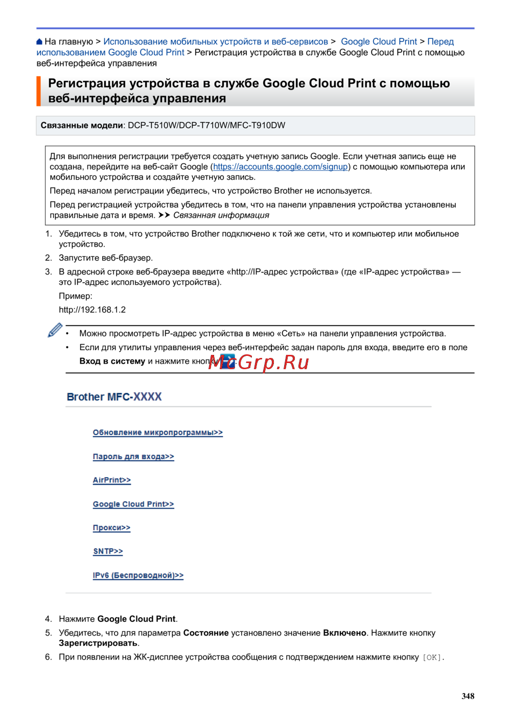 Brother DCP-T310 InkBenefit Plus [354/562] Регистрация устройства в службе google cloud print с помощью веб интерфейса управления
