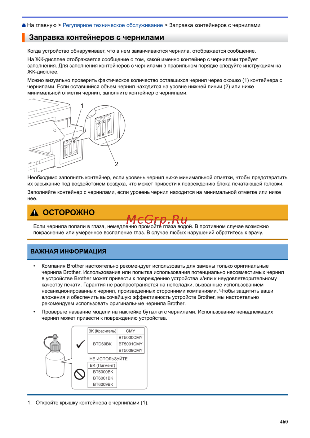 заполнения. Для заполнения контейнеров с чернилами в правильном порядке следуйте инструкциям на