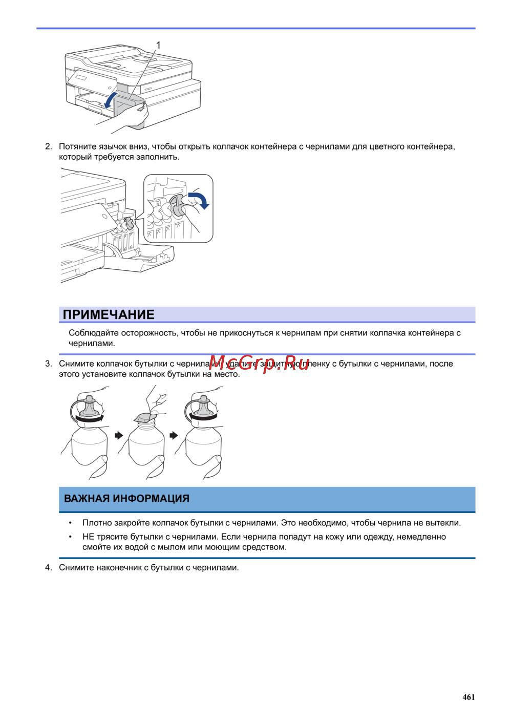 • НЕ трясите бутылки с чернилами. Если чернила попадут на кожу или одежду, немедленно