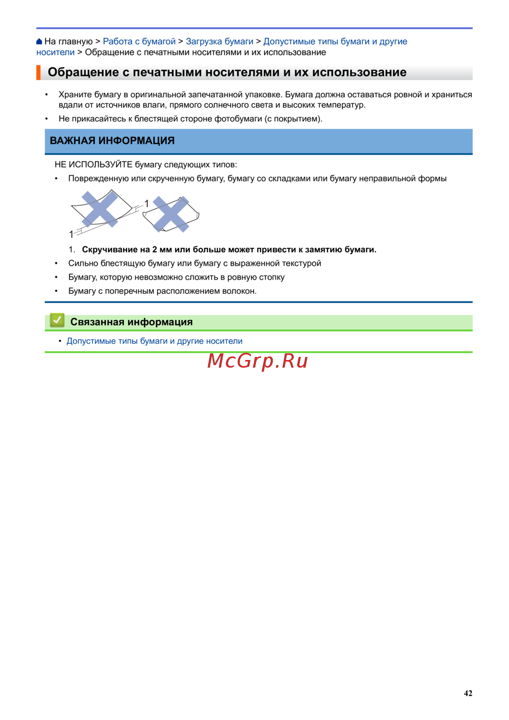 На главную > Работа с бумагой > Загрузка бумаги > Допустимые типы бумаги и другие
