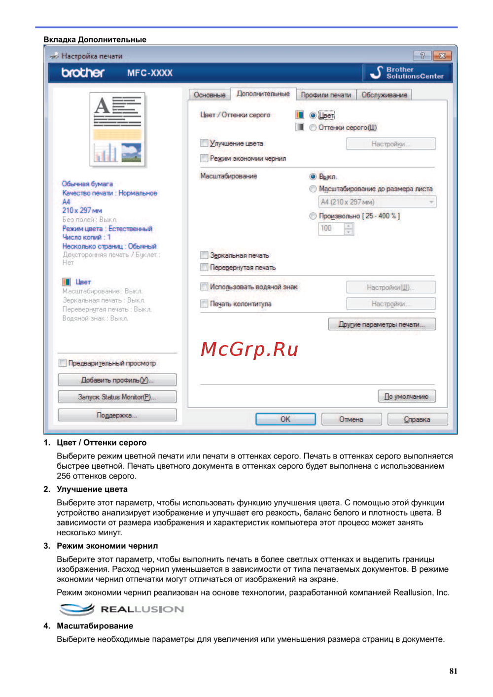 - Эта функция доступна для моделей mfc p.554