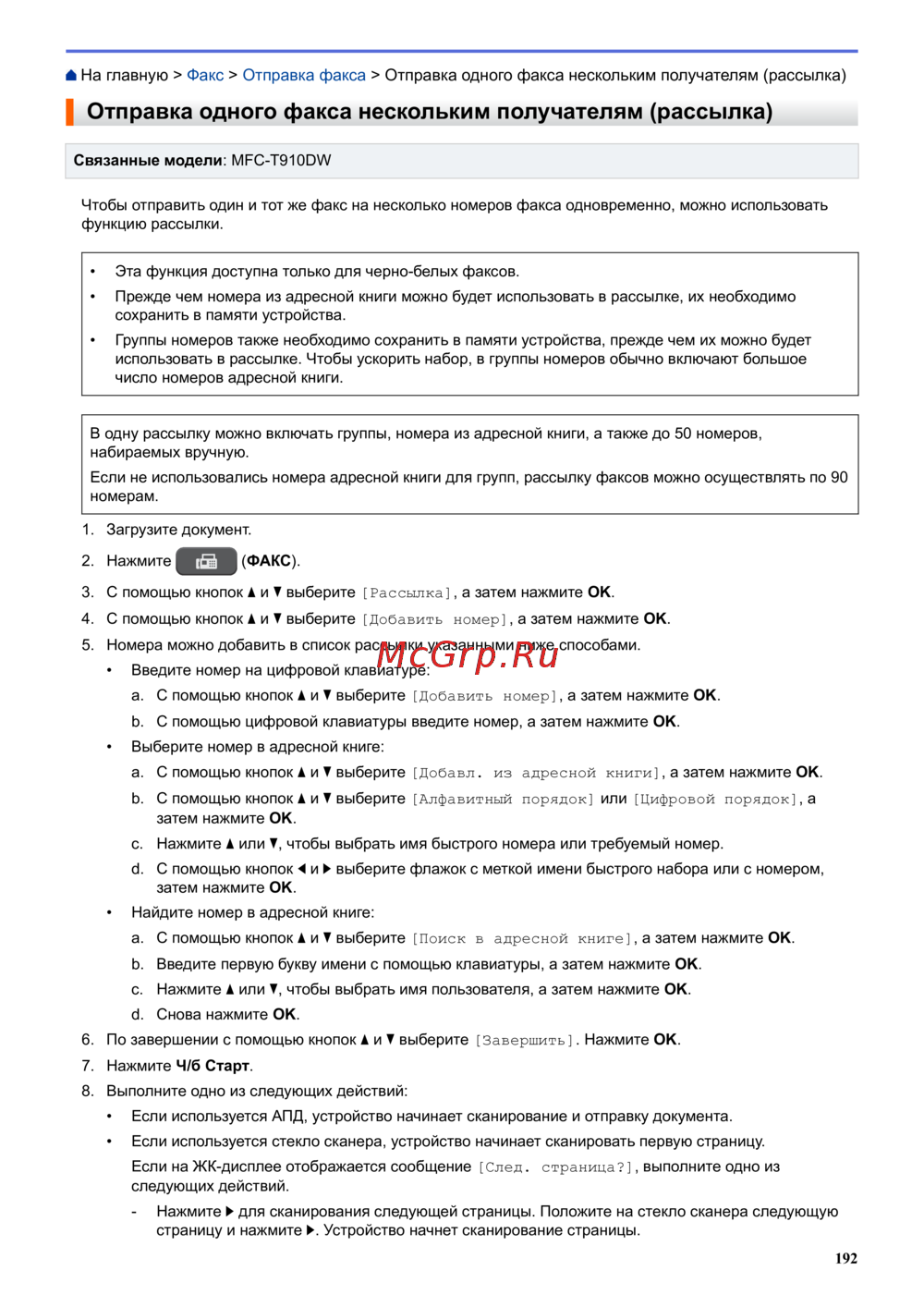На главную > Факс > Отправка факса > Отправка одного факса нескольким получателям (рассылка)