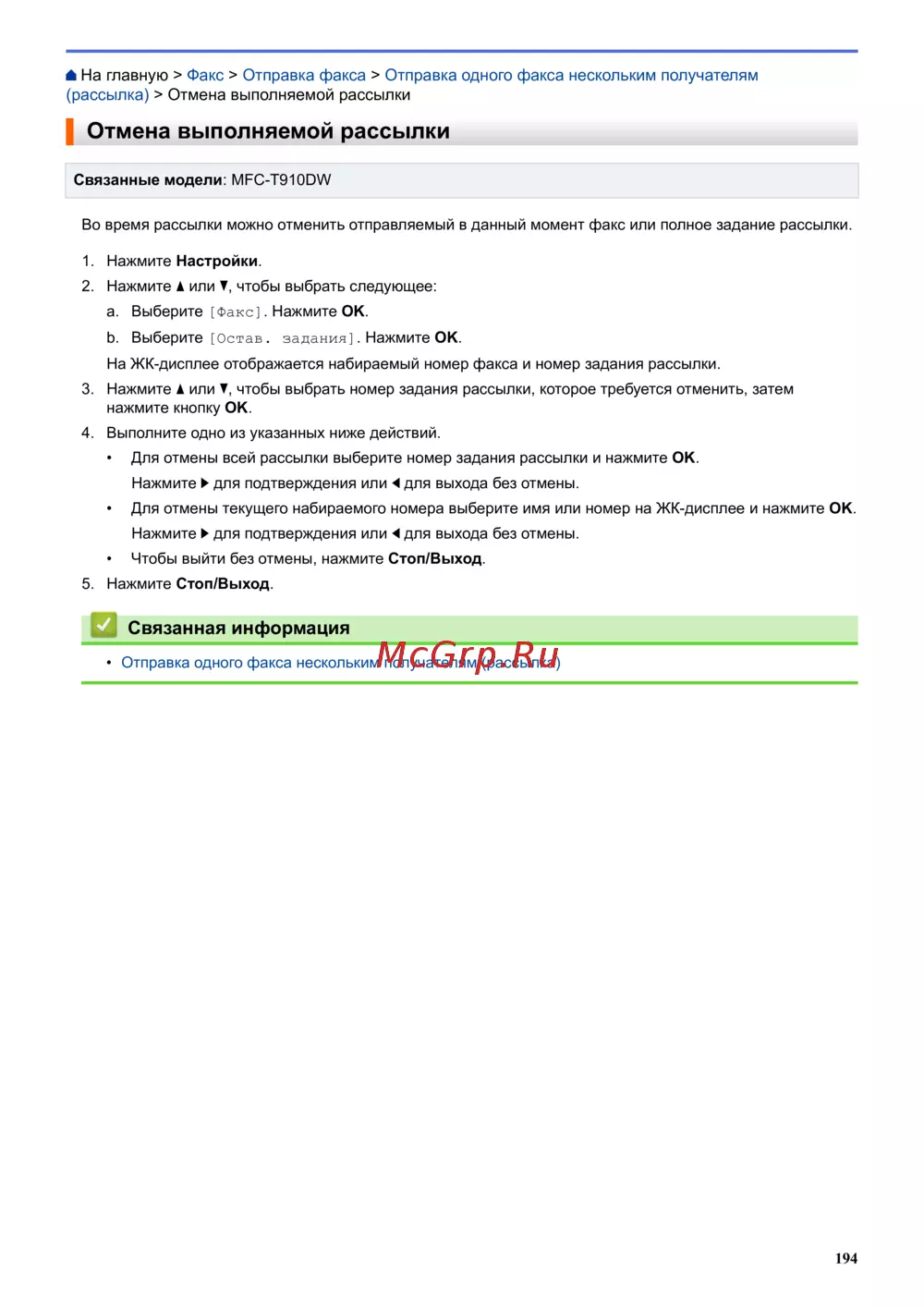 На главную > Факс > Отправка факса > Отправка одного факса нескольким получателям