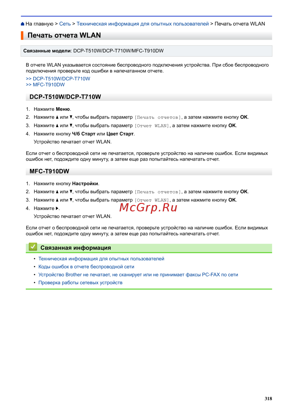 Brother DCP-T510W InkBenefit Plus — как напечатать отчет WLAN для проверки беспроводного подключения [324/562]