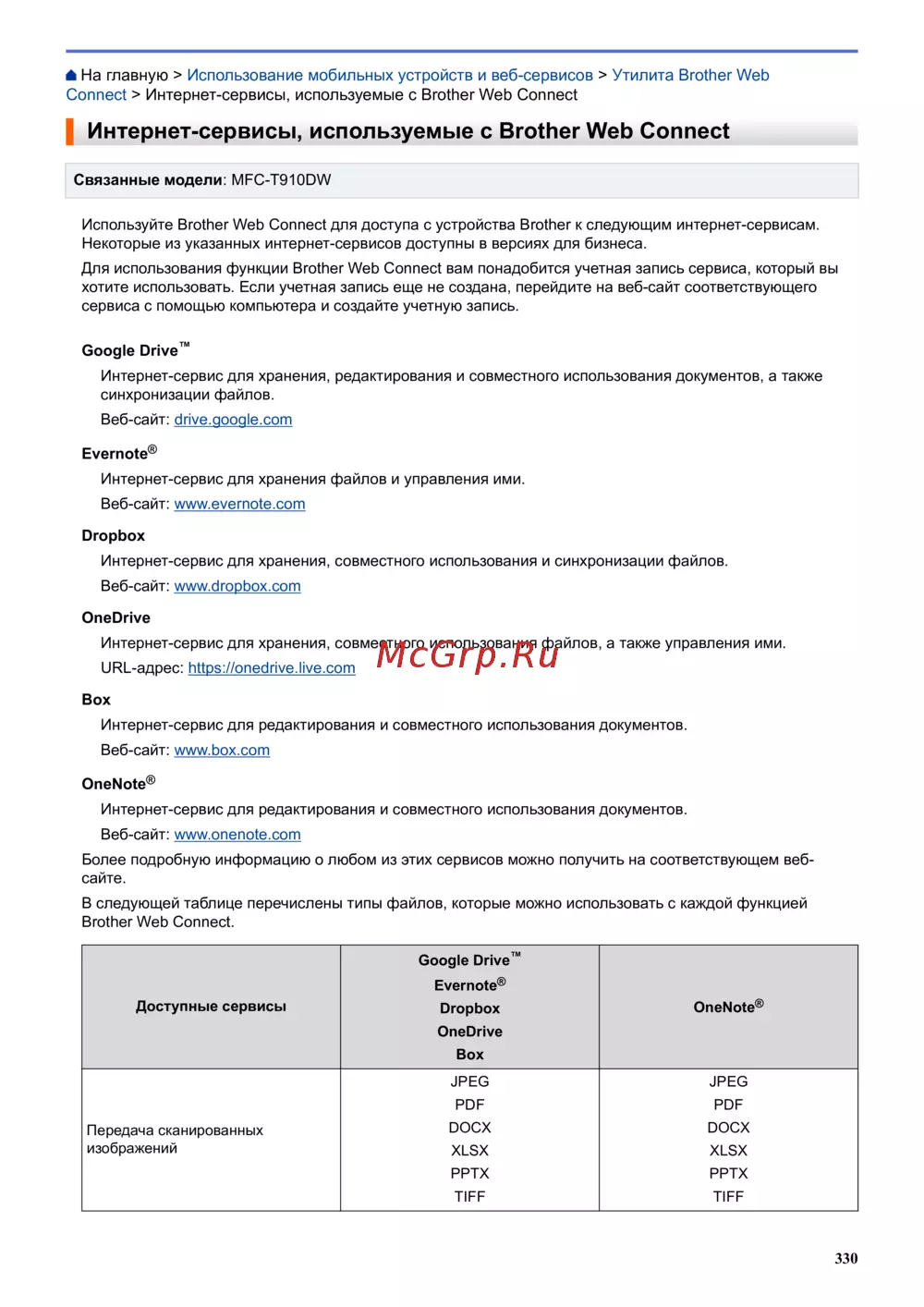 Используйте Brother Web Connect для доступа с устройства Brother к следующим интернет-сервисам.
