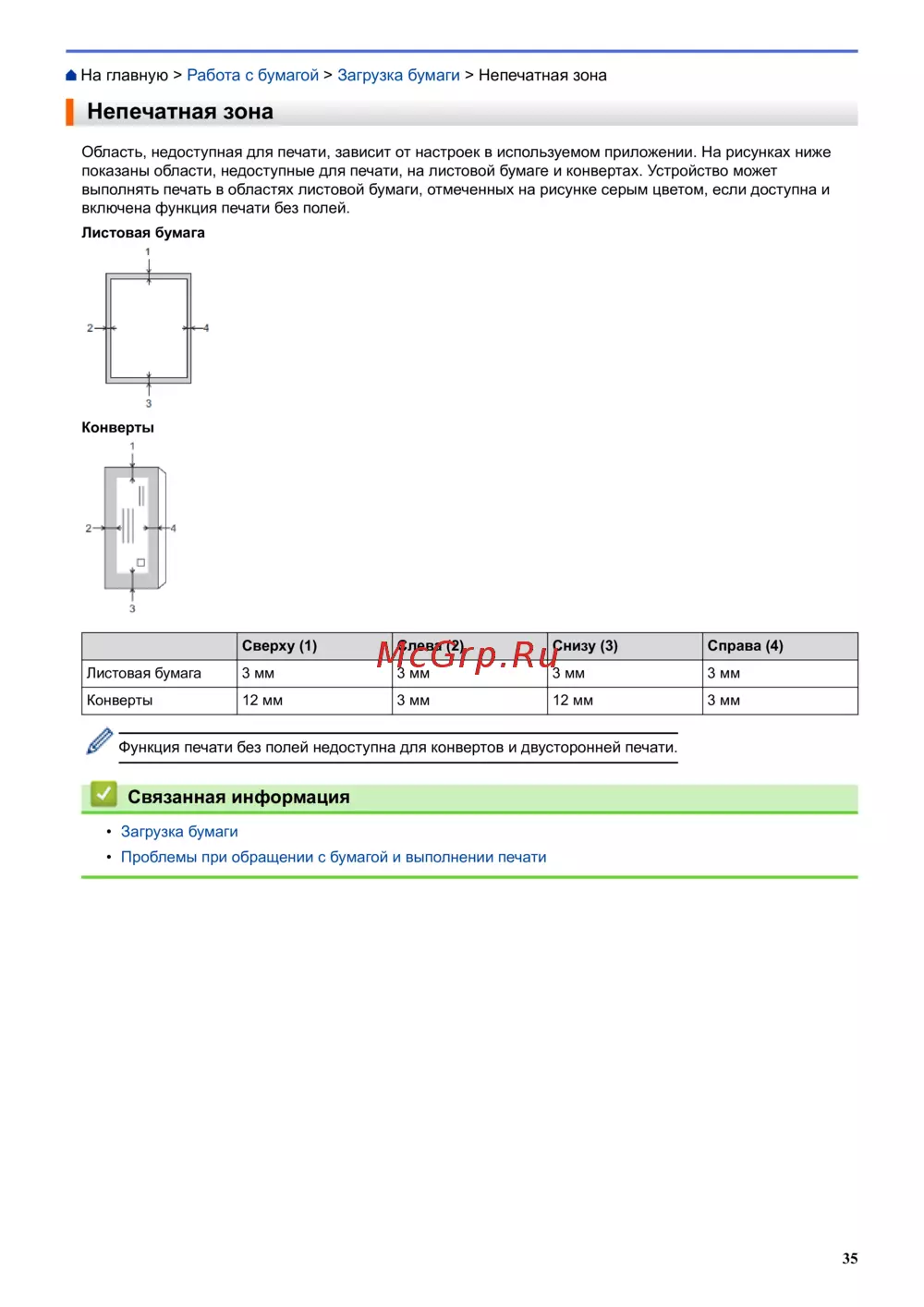 - Область недоступная для печати зависит от настроек в используемом приложении на рисунках ниже показаны области недоступные для печати на листовой бумаге и конвертах устройство может выполнять печать в областях листовой бумаги отмеченных на рисунке серым цветом если доступна и включена функция печати без полей p.41
