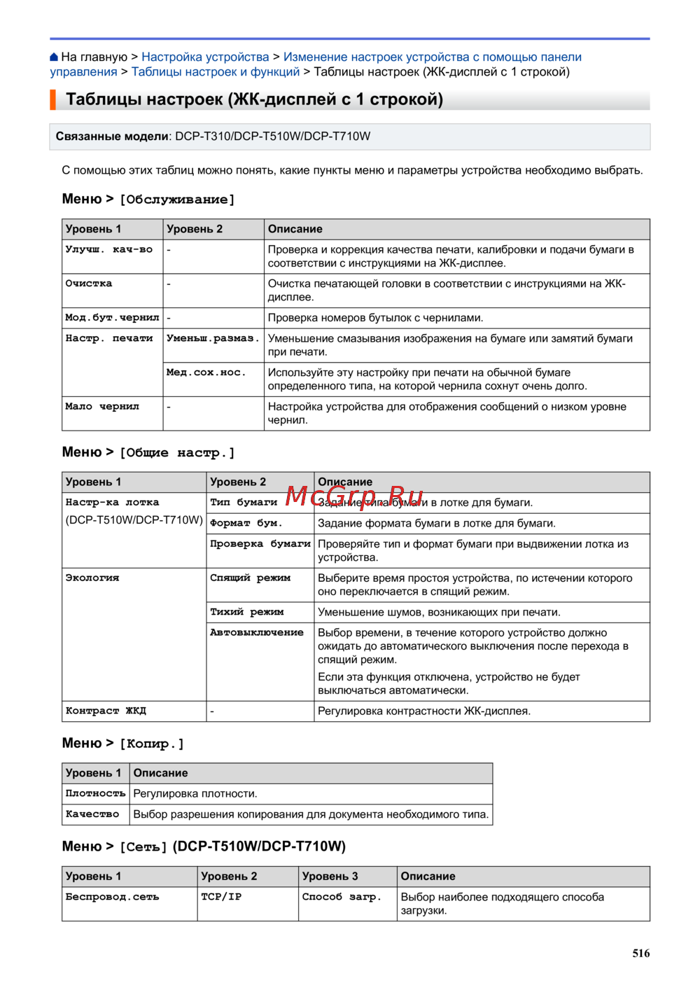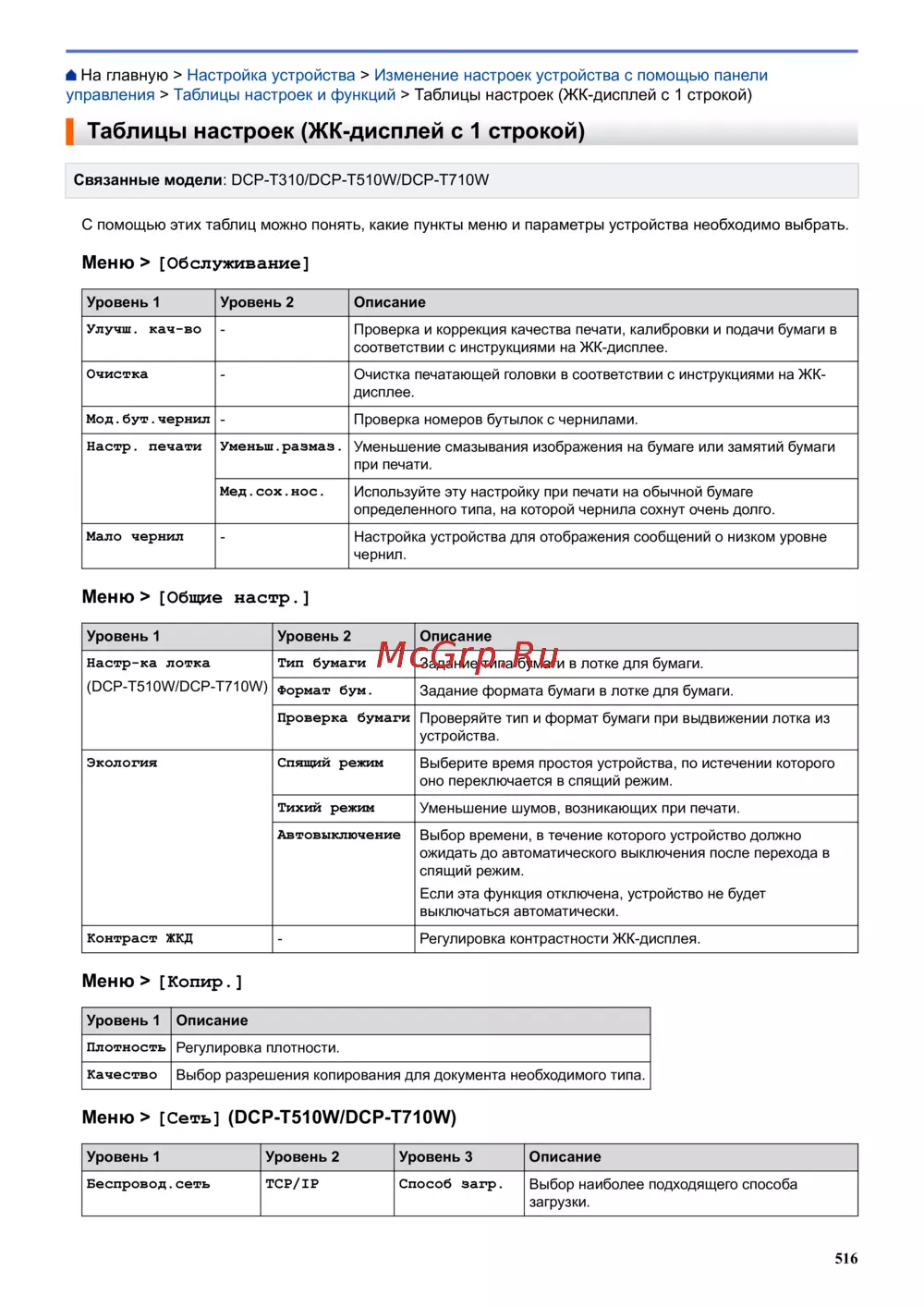Brother DCP-T510W InkBenefit Plus [522/562] Таблицы настроек жк дисплей с 1 строкой