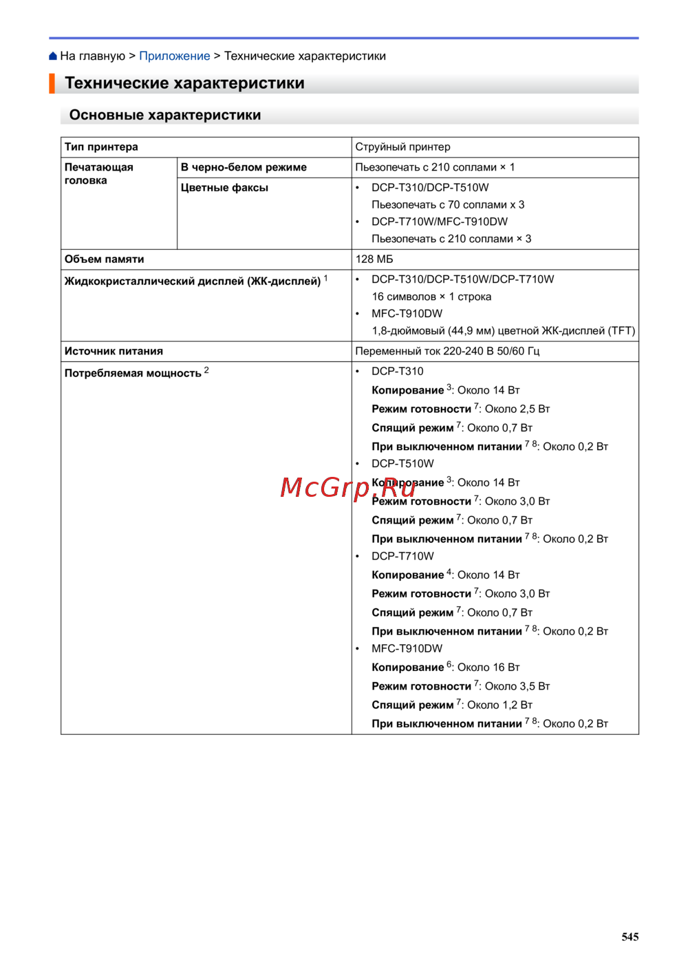 Brother DCP-T510W InkBenefit Plus [551/562] Основные характеристики