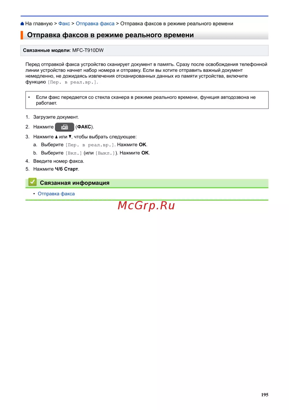 На главную > Факс > Отправка факса > Отправка факсов в режиме реального времени