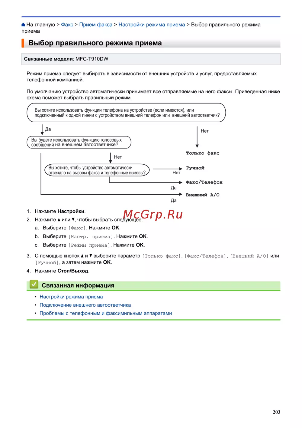 На главную > Факс > Прием факса > Настройки режима приема > Выбор правильного режима