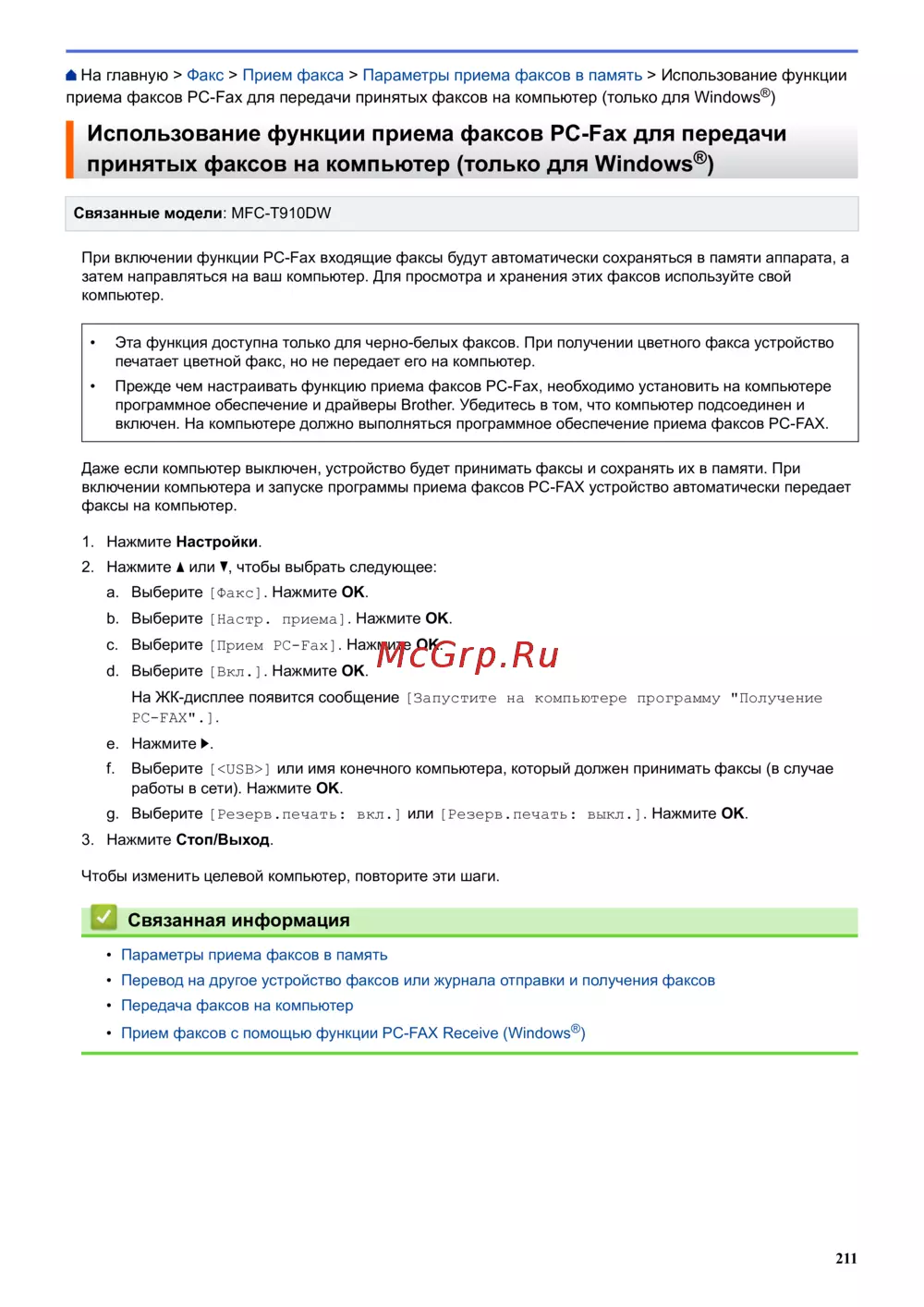 приема факсов PC-Fax для передачи принятых факсов на компьютер (только для Windows
