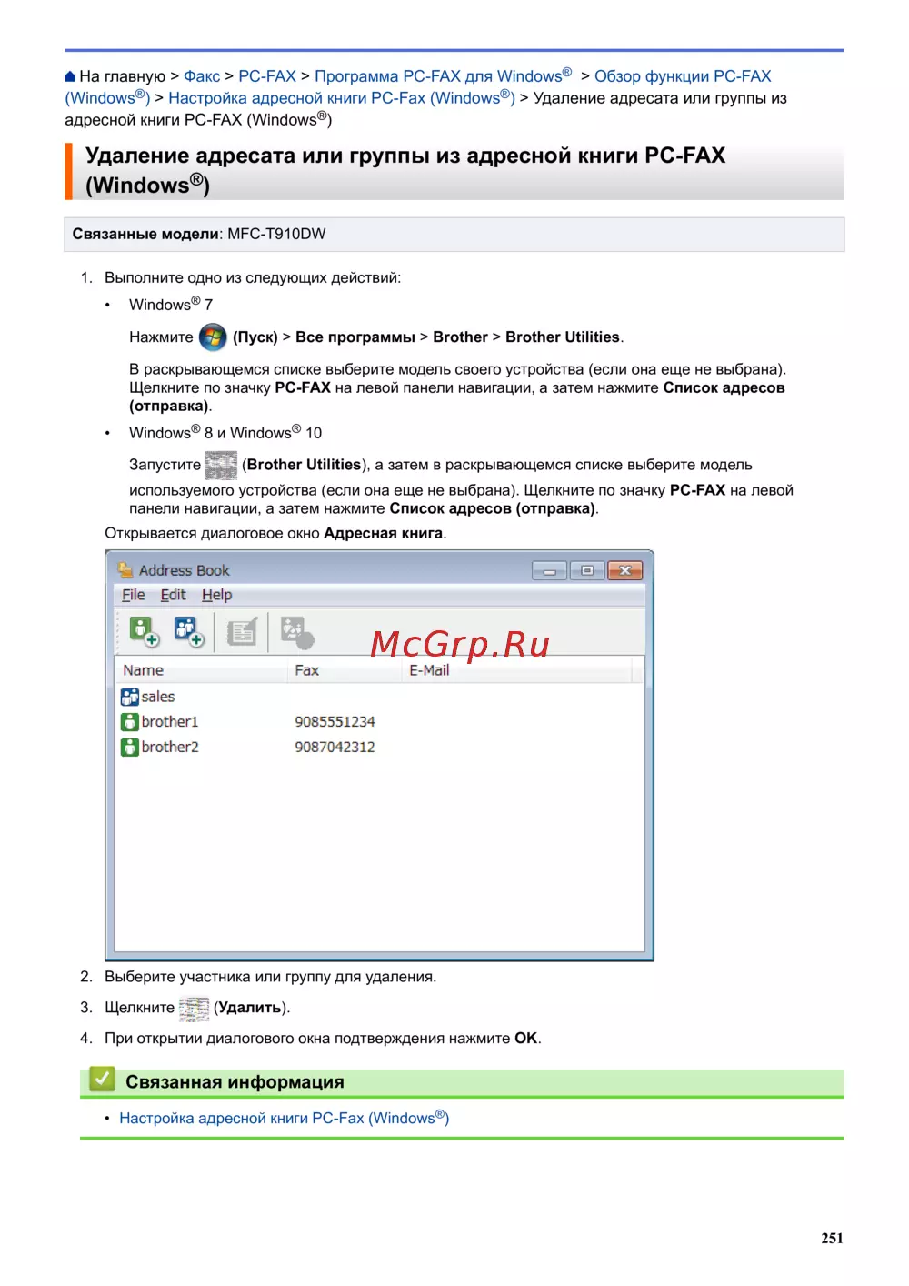 Пошаговая инструкция по удалению адресата или группы в адресной книге PC-FAX для Windows 7, 8 и 10. Настройка и управление адресной книгой Brother.