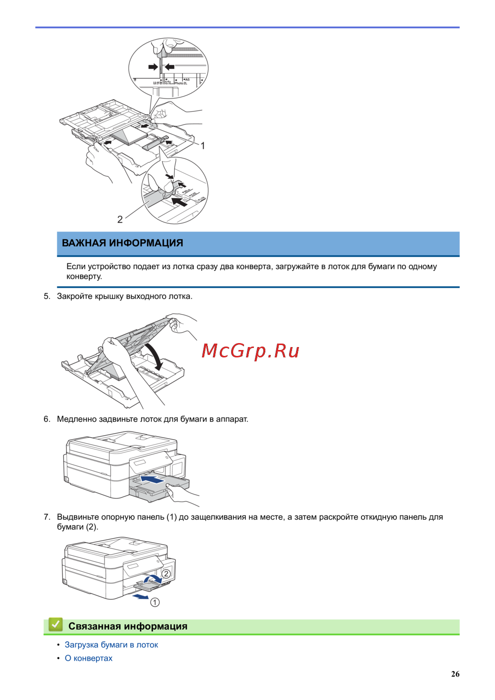 Если устройство подает из лотка сразу два конверта, загружайте в лоток для бумаги по одному