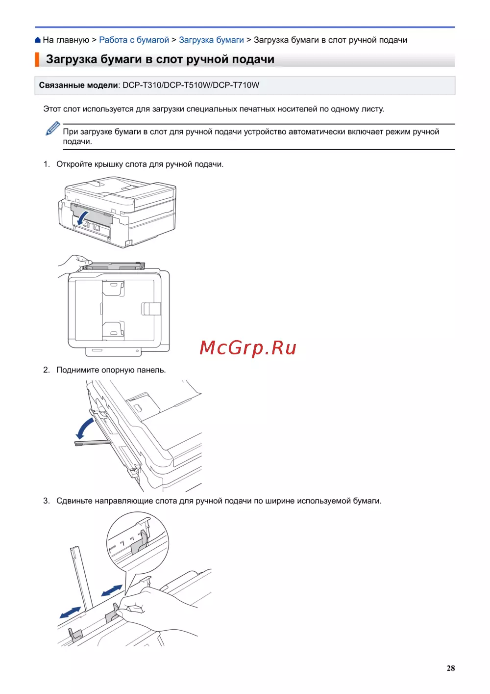 На главную > Работа с бумагой > Загрузка бумаги > Загрузка бумаги в слот ручной подачи