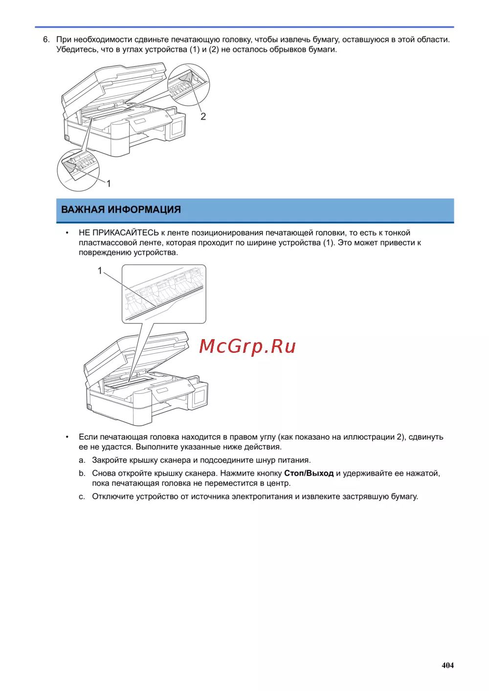 c. Отключите устройство от источника электропитания и извлеките застрявшую бумагу.