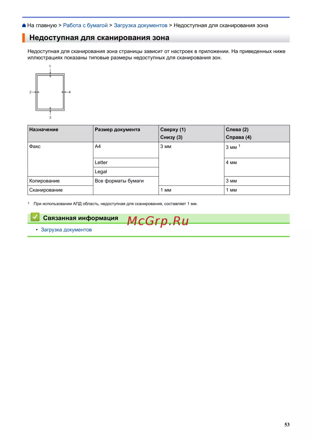 На главную > Работа с бумагой > Загрузка документов > Недоступная для сканирования зона