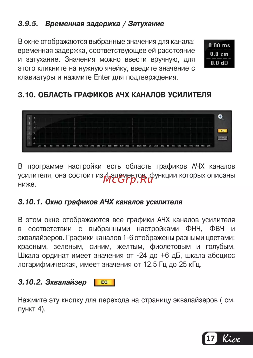 3 9 5 Временная задержка Затухание В окне отображаются выбранные значения для канала временная задержка соответствующее ей расстояние и затухание Значения можно ввести вручную для этого кликните на нужную ячейку введите значение с клавиатуры и нажмите Enter для подтверждения 0 00 ms 0 0 cm 0 0 dB 3 10 ОБЛАСТЬ ГРАФИКОВ АЧХ КАНАЛОВ УСИЛИТЕЛЯ В программе настройки есть область графиков АЧХ каналов усилителя она состоит из 4 элементов функции которых описаны ниже 3 10 1 Окно графиков АЧХ каналов усилителя В этом окне отображаются все графики АЧХ каналов усилителя в соответствии с выбранными настройками ФНЧ ФВЧ и эквалайзеров Графики каналов 1 6 отображены разными цветами красным зеленым синим желтым фиолетовым и голубым Шкала ординат имеет значения от 24 до 6 дБ шкала абсцисс логарифмическая имеет значения от 12 5 Гц до 25 кГц 3 10 2 Эквалайзер EQ Нажмите эту кнопку для перехода на страницу эквалайзеров см пункт 4 Е