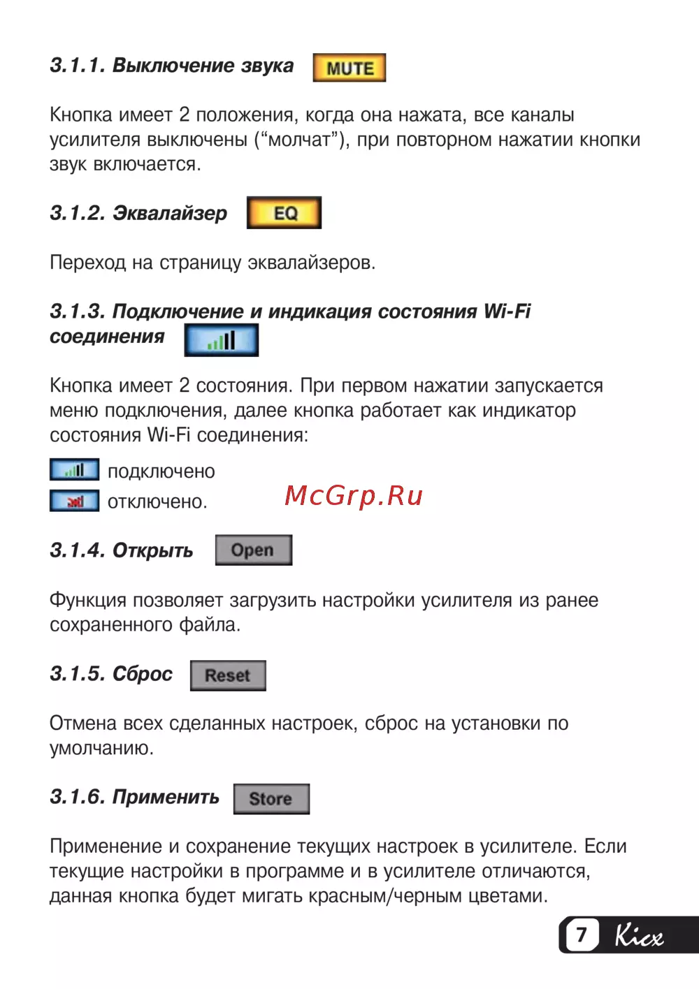 3 1 1 Выключение звука MUTE Кнопка имеет 2 положения когда она нажата все каналы усилителя выключены молчат при повторном нажатии кнопки звук включается 3 1 2 Эквалайзер Переход на страницу эквалайзеров 3 1 3 Подключение и индикация состояния Wi Fi соединения I у Кнопка имеет 2 состояния При первом нажатии запускается меню подключения далее кнопка работает как индикатор состояния Wi Fi соединения I и подключено I ad I отключено 3 1 4 Открыть Open Функция позволяет загрузить настройки усилителя из ранее сохраненного файла 3 1 5 Сброс Reset Отмена всех сделанных настроек сброс на установки по умолчанию 3 1 6 Применить Store Применение и сохранение текущих настроек в усилителе Если текущие настройки в программе и в усилителе отличаются данная кнопка будет мигать красным черным цветами