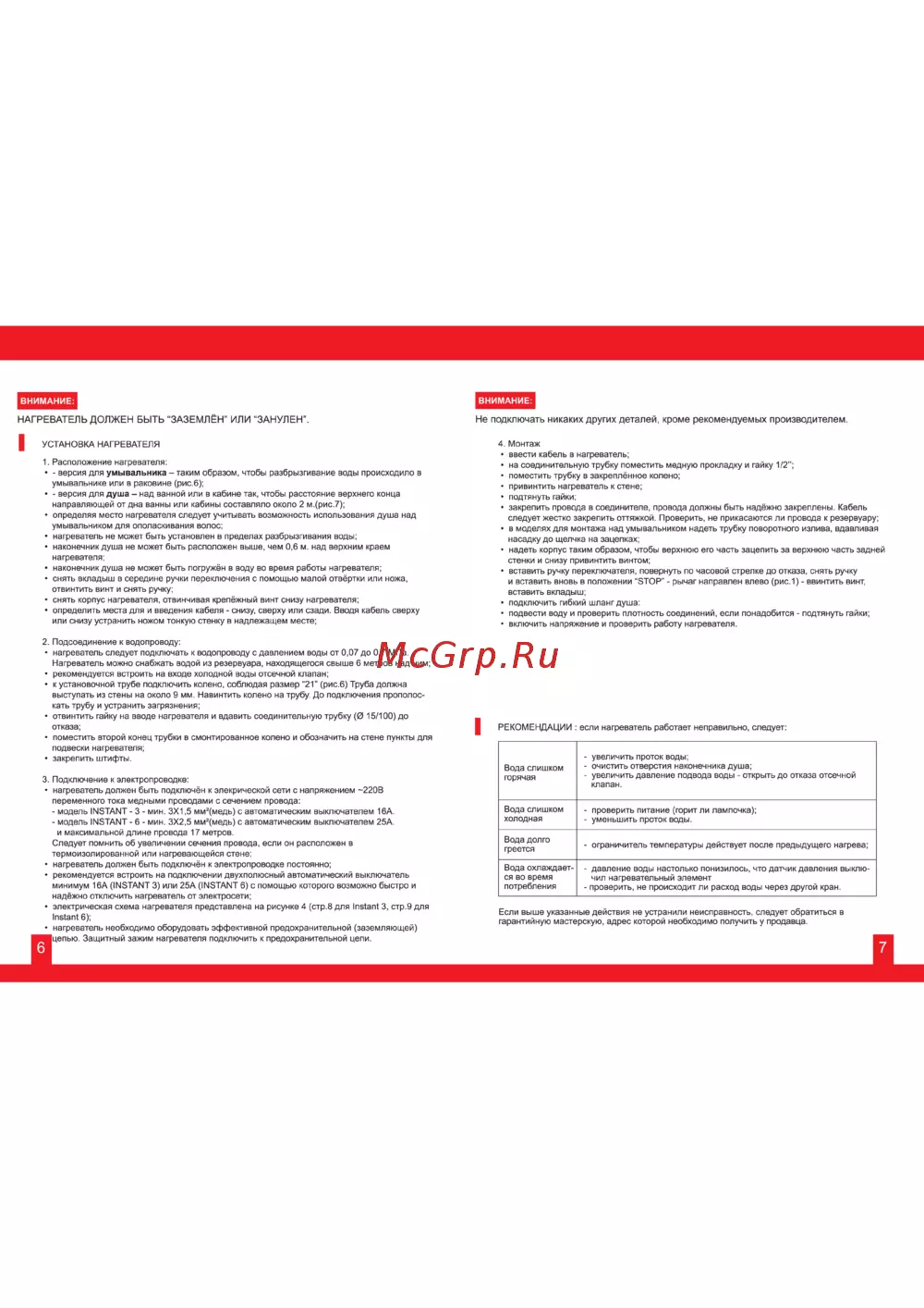 ВНИМАНИЕ НАГРЕВАТЕЛЬ ДОЛЖЕН БЫТЬ ЗАЗЕМЛЁН ИЛИ ЗАНУЛЕН УСТАНОВКА НАГРЕВАТЕЛЯ 1 Расположение нагревателя версия для умывальника таким образом чтобы разбрызгивание воды происходило в умывальнике или в раковине рис 6 версия для душа над ванной или в кабине так чтобы расстояние верхнего конца направляющей от дна ванны или кабины составляло около 2 м рис 7 определяя место нагревателя следует учитывать возможность использования душа над умывальником для ополаскивания волос нагреватель не может быть установлен в пределах разбрызгивания воды наконечник душа не гложет быть расположен выше чем 0 6 м над верхним краем нагревателя наконечник душа не может быть погружён в воду во время работы нагревателя снять вкладыш в середине ручки переключения с помощью малой отвёртки или ножа отвинтить винт и снять ручку снять корпус нагревателя отвинчивая крепёжный винт снизу нагревателя определить места для и введения кабеля снизу сверху или сзади Вводя кабель сверху или снизу устранить ножом тонкую стенку в надлежащем месте 2 Подсоединение к водопроводу нагреватель следует подключать к водопроводу с давлением воды от 0 07 до 0 7 МПа Нагреватель можно снабжать водой из резервуара находящегося свыше 6 метров над ним рекомендуется встроить на входе холодной воды отсечной клапан к установочной трубе подключить колено соблюдая размер 21 рис 6 Труба должна выступать из стены на около 9 мм Навинтить колено на трубу До подключения прополос кать трубу и устранить загрязнения отвинтить гайку на вводе нагревателя и вдавить соединительную трубку 0 15 100 до отказа поместить второй конец трубки в смонтированное колено и обозначить на стене пункты для подвески нагревателя закрепить штифты 3 Подключение к электропроводке нагреватель должен быть подключён к элекрической сети с напряжением 220В переменного тока медными проводами с сечением провода модель INSTANT 3 мин 3X1 5 ммг медь с автоматическим выключателем 16А модель INSTANT 6 мин 3X2 5 ммг медь с автоматическим выключателем 25А и максимальной длине провода 17 метров Следует помнить об увеличении сечения провода если он расположен в термоизолированной или нагревающейся стене нагреватель должен быть подключён к электропроводке постоянно рекомендуется встроить на подключении двухполюсный автоматический выключатель минимум 16А INSTANT 3 или 25А INSTANT 6 с помощью которого возможно быстро и надёжно отключить нагреватель от электросети электрическая схема нагревателя представлена на рисунке 4 стр 8 для Instant 3 стр 9 для Instant 6 нагреватель необходимо оборудовать эффективной предохранительной заземляющей цепью Защитный зажим нагревателя подключить к предохранительной цепи ВНИМАНИЕ Не подключать никаких других деталей кроме рекомендуемых производителем 4 Монтаж ввести кабель в нагреватель на соединительную трубку поместить медную прокладку и гайку 1 2 поместить трубку в закреплённое колено привинтить нагреватель к стене подтянуть гайки закрепить провода в соединителе провода должны быть надёжно закреплены Кабель следует жестко закрепить оттяжкой Проверить не прикасаются ли провода к резервуару в моделях для монтажа над умывальником надеть трубку поворотного излива вдавливая насадку до щегмка на зацепках надеть корпус таким образом чтобы верхнюю его часть зацепить за верхнюю часть задней стенки и снизу привинт