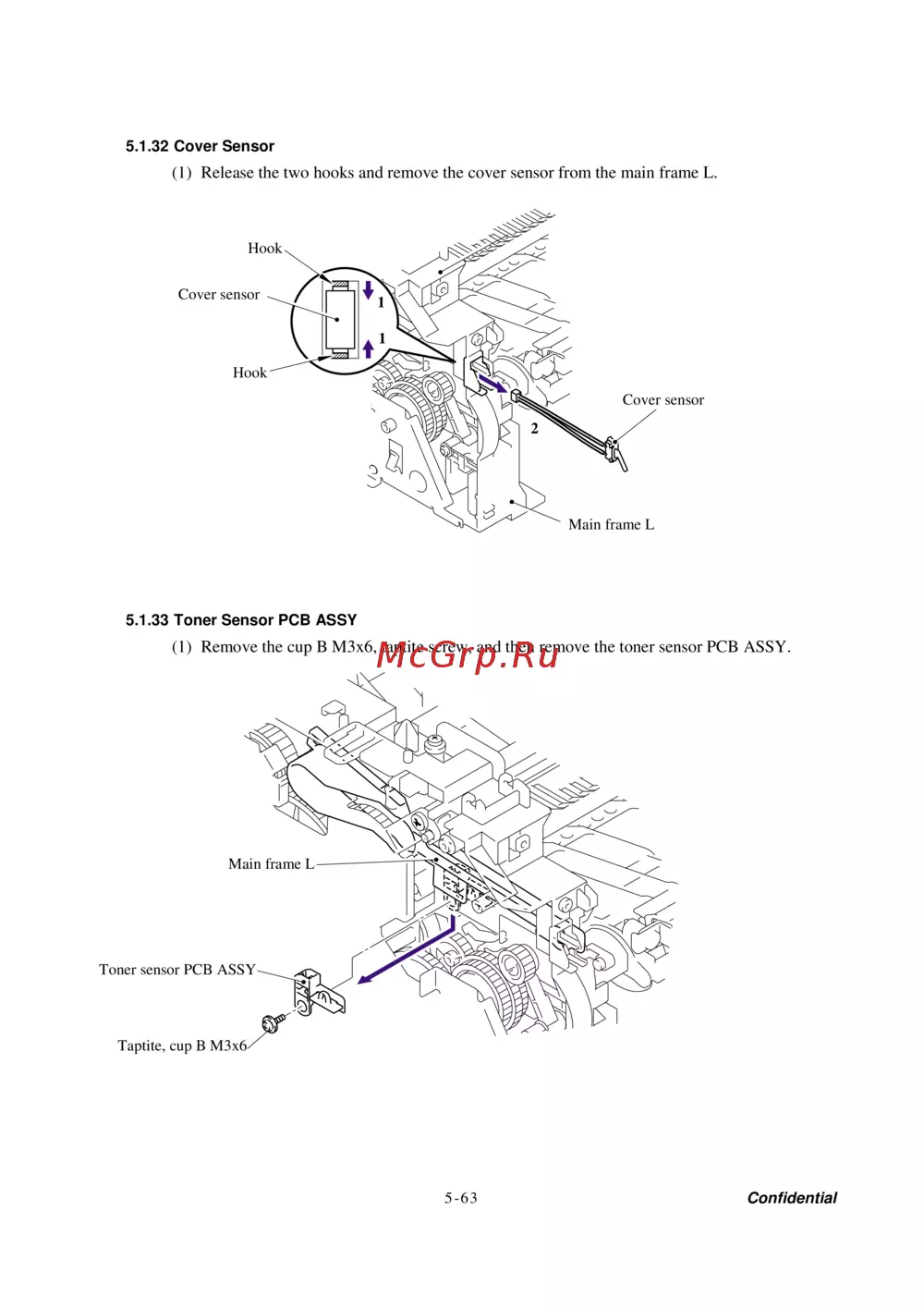 (1) Remove the cup B M3x6, taptite screw, and then remove the toner sensor PCB ASSY.