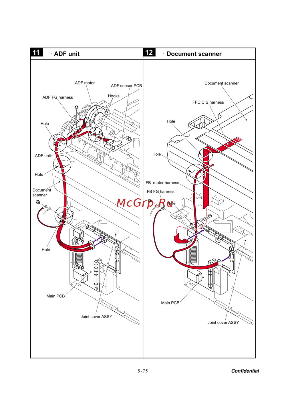 - This mechanism consists of the document cover the scanner unit scanner cover and the automatic document feeder adf the scanner unit consists of a scanner top cover cis unit cis drive assembly and scanner base the detailed illustration on the next page shows the components making up the adf document pull in roller document separation roller document feed roller adf motor and document front and rear sensors for further details on the sensors see section 3 p.48