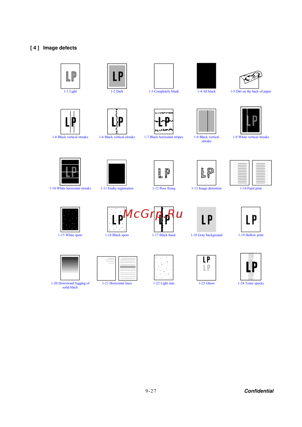 1-21 Horizontal lines 1-22 Light rain 1-23 Ghost 1-24 Toner specks