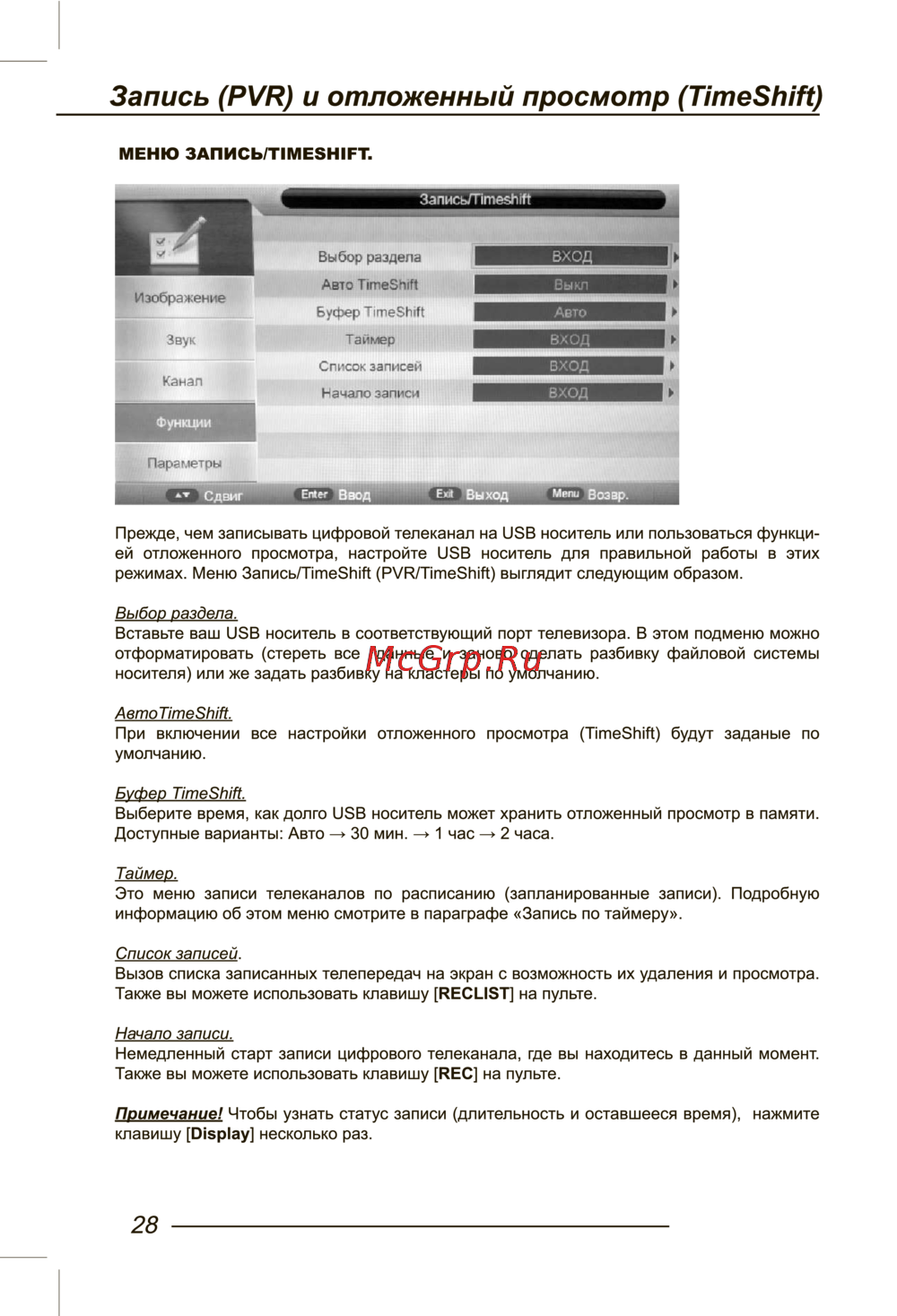 Запись PVR и отложенный просмотр TimeShift МЕНЮ ЗАПИСЬ TIMESHIFT Прежде чем записывать цифровой телеканал на USB носитель или пользоваться функци ей отложенного просмотра настройте USB носитель для правильной работы в этих режимах Меню Запись TimeShift PVR TimeShift выглядит следующим образом Выбор раздела Вставьте ваш USB носитель в соответствующий порт телевизора В этом подменю можно отформатировать стереть все данные и заново сделать разбивку файловой системы носителя или же задать разбивку на кластеры по умолчанию AemoTimeShift При включении умолчанию все настройки отложенного просмотра TimeShift будут заданью по Буфер TimeShift Выберите время как долго USB носитель может хранить отложенный просмотр в памяти Доступные варианты Авто 30 мин 1 час 2 часа Таймер Это меню записи телеканалов по расписанию запланированные информацию об этом меню смотрите в параграфе Запись по таймеру записи Подробную Список записей Вызов списка записанных телепередач на экран с возможность их удаления и просмотра Также вы можете использовать клавишу RECLIST на пульте Начало записи Немедленный старт записи цифрового телеканала где вы находитесь в данный момент Также вы можете использовать клавишу REC на пульте Примечание Чтобы узнать статус записи длительность и оставшееся время нажмите клавишу Display несколько раз 28