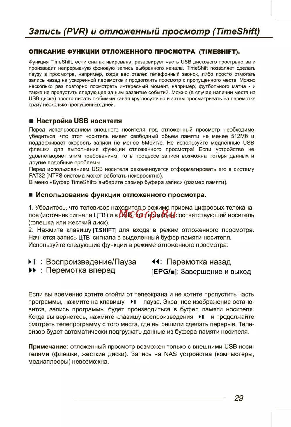 Запись PVR и отложенный просмотр TimeShift ОПИСАНИЕ ФУНКЦИИ ОТЛОЖЕННОГО ПРОСМОТРА TIMESHIFT Функция TimeShift если она активирована резервирует часть USB дискового пространства и производит непрерывную фоновую запись выбранного канала TimeShift позволяет сделать паузу в просмотре например когда вас отвлек телефонный звонок либо просто отмотать запись назад на ускоренной перемотке и продолжить просмотр с пропущенного места Можно несколько раз повторно посмотреть интересный момент например футбольного матча и также не пропустить следующее за ним развитие событий Можно в случае наличии места на USB диске просто писать любимый канал круглосуточно и затем просматривать на перемотке сразу несколько пропущенных дней Настройка USB носителя Перед использованием внешнего носителя под отложенный просмотр необходимо убедиться что этот носитель имеет свободный объем памяти не менее 512Мб и поддерживает скорость записи не менее 5Мбит с Не используйте медленные USB флешки для выполнения функции отложенного просмотра Если устройство не удовлетворяет этим требованиям то в процессе записи возможна потеря данных и другие подобные проблемы Перед использованием USB носителя рекомендуется отформатировать его в систему FAT32 NTFS система может работать некорректно В меню Буфер TimeShift выберите размер буфера записи размер памяти Использование функции отложенного просмотра 1 Убедитесь что телевизор находится в режиме приема цифровых телекана лов источник сигнала ЦТВ и в USB порт вставлен соответствующий носитель флешка или жесткий диск 2 Нажмите клавишу T SHIFT для входа в режим отложенного просмотра Начнется запись цтв сигнала в выделенный буфер памяти носителя Используйте следующие функции в режиме отложенного просмотра II Воспроизведение Пауза Перемотка назад Перемотка вперед EPG и Завершение и выход Если вы временно хотите отойти от телеэкрана и не хотите пропустить часть программы нажмите на клавишу HI пауза Экранное изображение остано вится запись программы будет производиться в буфер памяти носителя Когда вы вернетесь нажмите клавишу воспроизведения HI и продолжайте смотреть телепрограмму с того места где вы решили сделать перерыв Теле визор будет автоматически подгружать данные из буфера памяти носителя Примечание отложенный просмотр возможен только с внешними USB носи телями флешки жесткие диски Запись на NAS устройства компьютеры медиаплееры невозможна 29