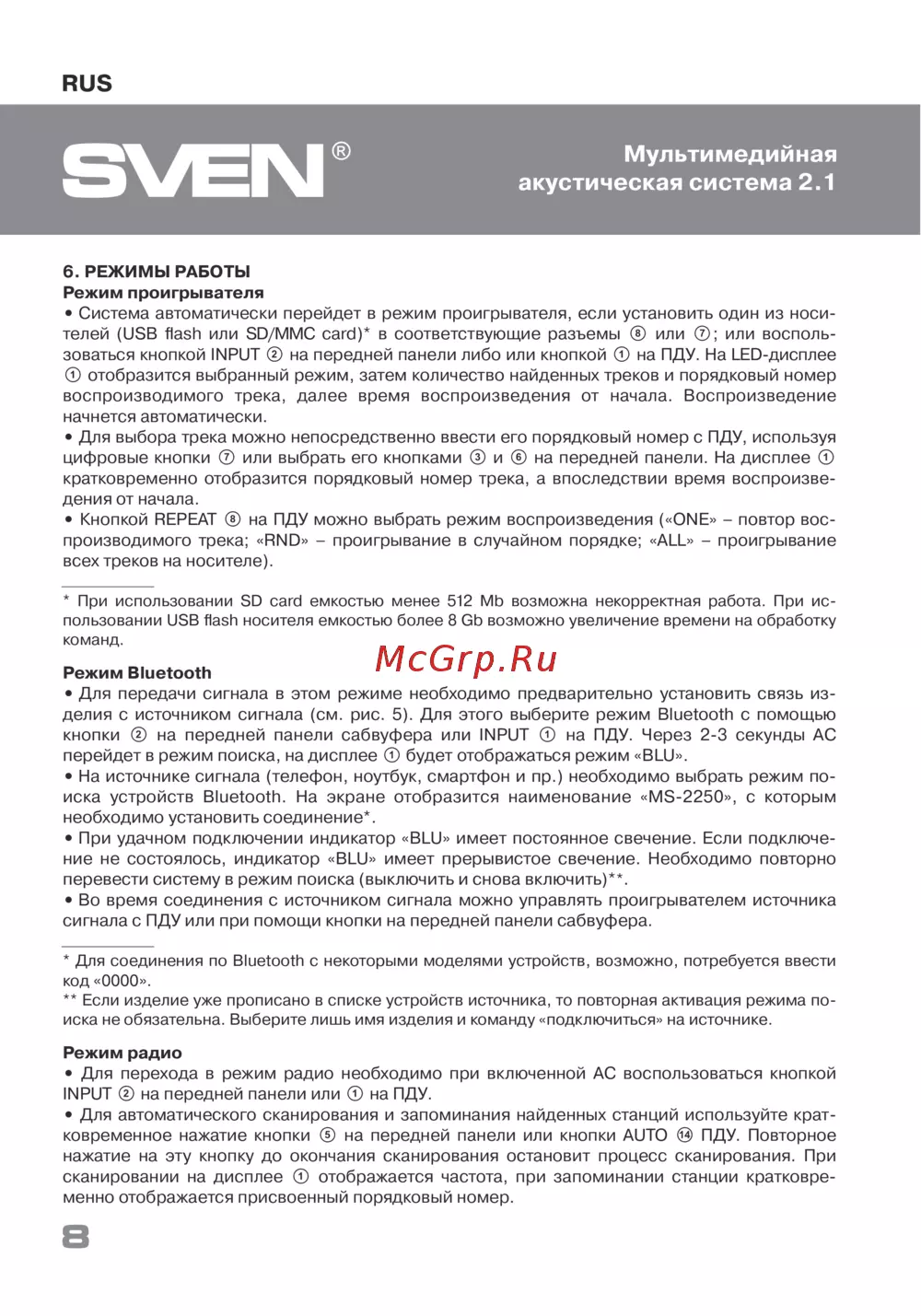 Sven MS-2250 — мультимедийная акустическая система 2.1: режимы работы и функции [8/28]
