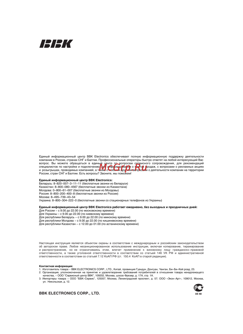 Единый информационный центр BBK Electronics работает ежедневно, без выходных и праздничных дней: