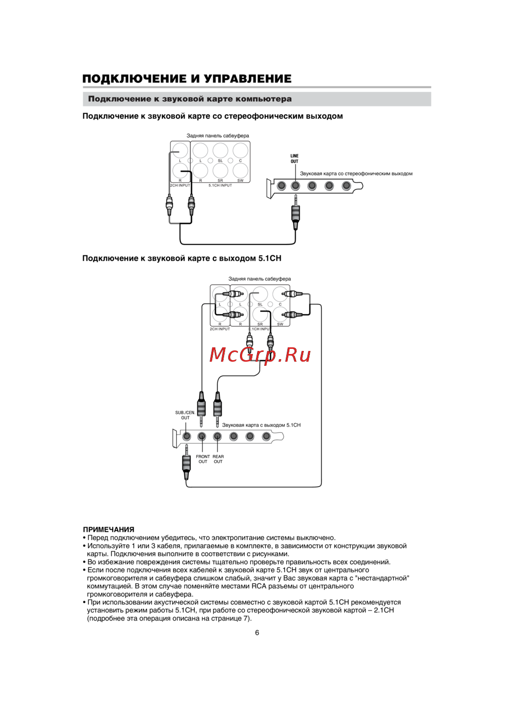 • При использовании акустической системы совместно с звуковой картой 5.1СН рекомендуется