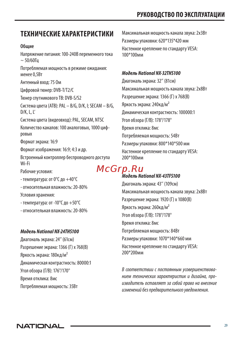 NATIONAL NX-32THS100 [29/32] Технические характеристики
