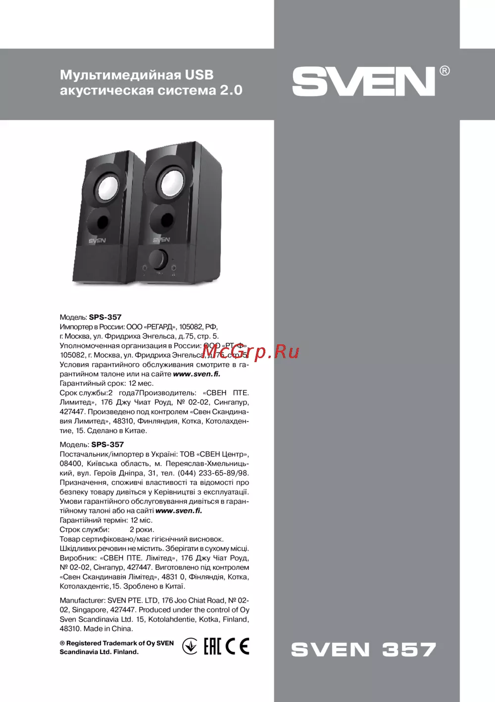 Manufacturer: SVEN PTE. LTD, 176 Joo Chiat Road, № 02-