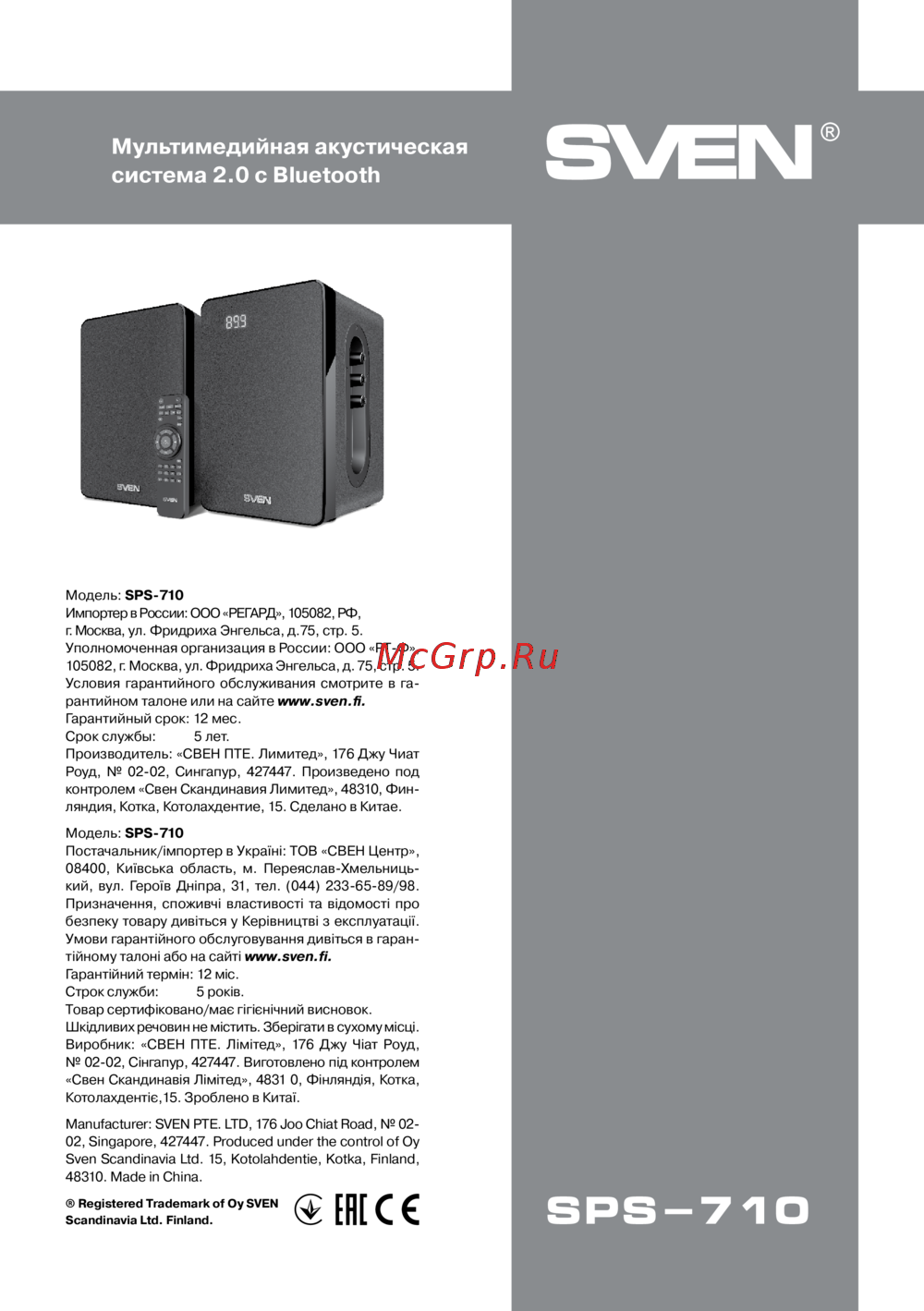 Постачальник/імпортер в Україні: ТОВ «СВЕН Центр»,